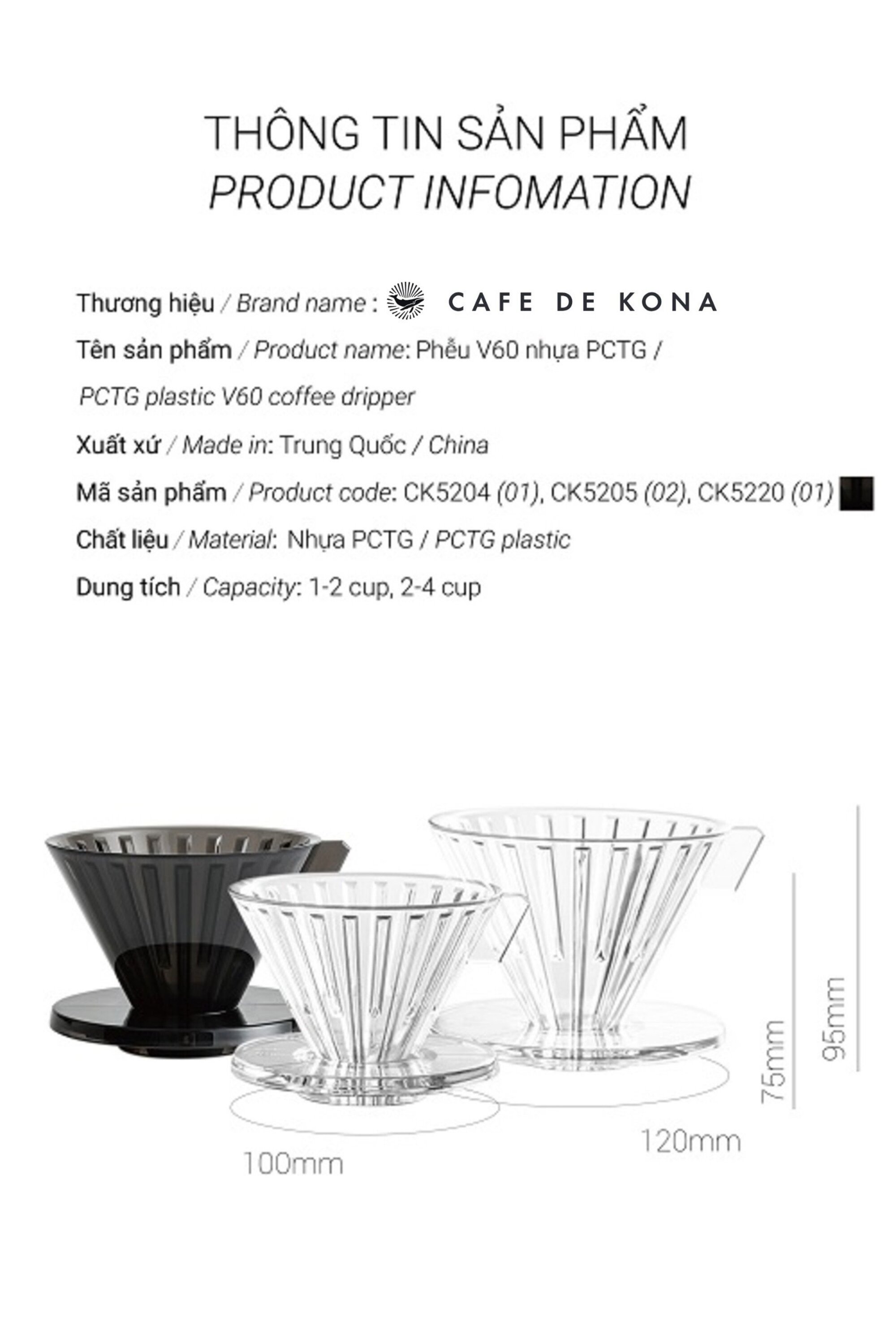 PHỄU V60 SIZE BẰNG NHỰA THỰC PHẨM PCTG CAFE DE KONA Phễu được làm từ nhựa tinh khiết có độ trong suốt như thuỷ tinh. Cấu tạo từ nhựa PCTG chuyên dùng trong sản xuất