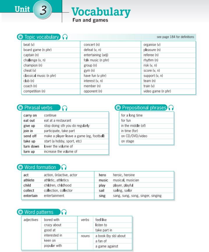 Bài tập về từ vựng cũng được phân thành từng mục giống như các mục từ vựng được giới thiệu ở đầu mỗi bài học (cụm động từ (phrasal verb), cụm giới từ (prepositional phrases), hình thành từ (word formation), mẫu từ (word patterns)).