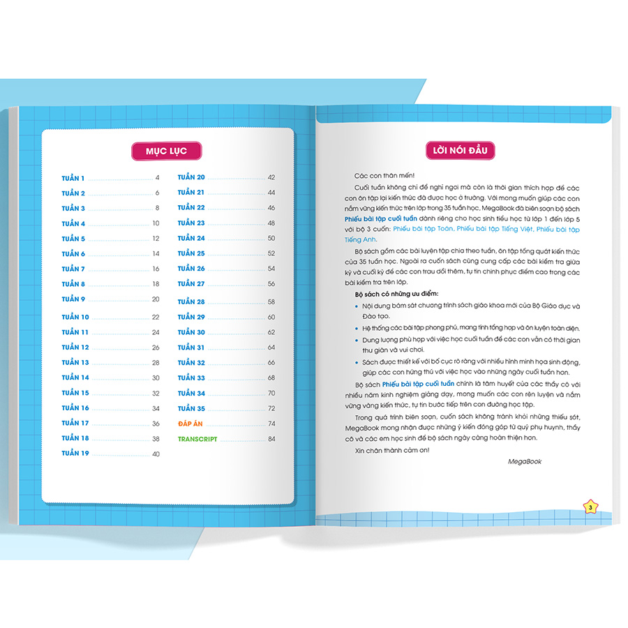 - Hệ thống các bài tập phong phú, mang tính tổng hợp và ôn luyện toàn diện. Hệ thống bài tập đa dạng, lượng phù hợp với việc học cuối tuần để các con vẫn có thời gian thư giãn và vui chơi. Đặc biệt, sau mỗi kì sẽ có bài ôn tập giữa kì và cuối kì giúp con có tài liệu ôn tập cho các kì kiểm tra.