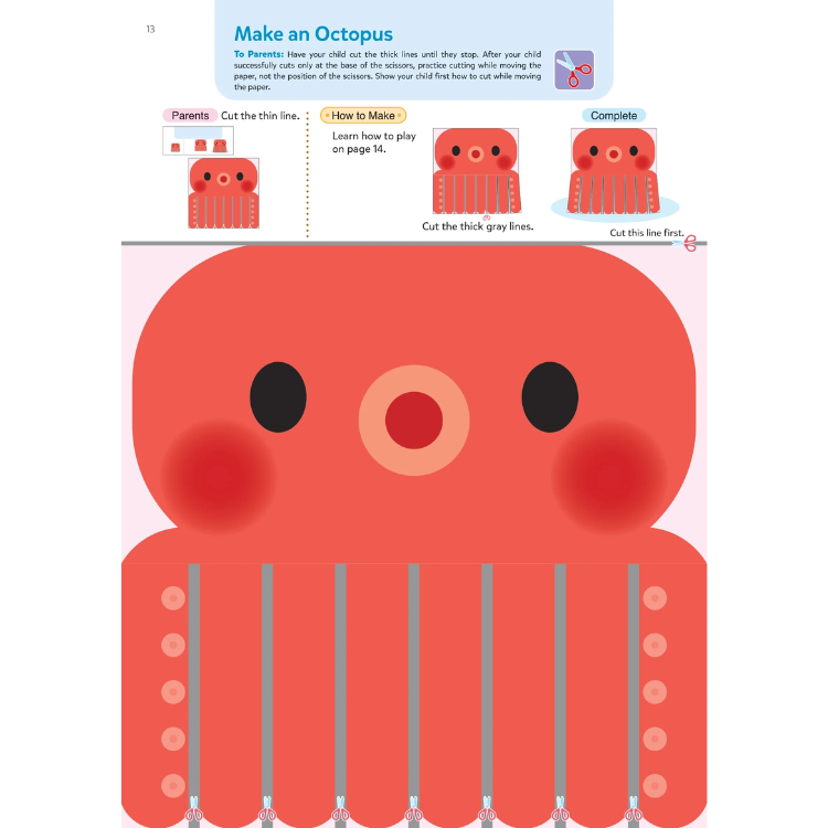Play Smart Cutting and Pasting 3+ is a book designed for children aged 3 and up, focusing on developing cutting, pasting, and fine motor skills. The book includes various engaging games and challenges such as cutting lines and shapes, labeling, using stickers, solving mazes, and counting. These activities are designed to help children get familiar with scissor skills and strengthen their fine motor abilities, thereby making them more confident and independent as they prepare for kindergarten.