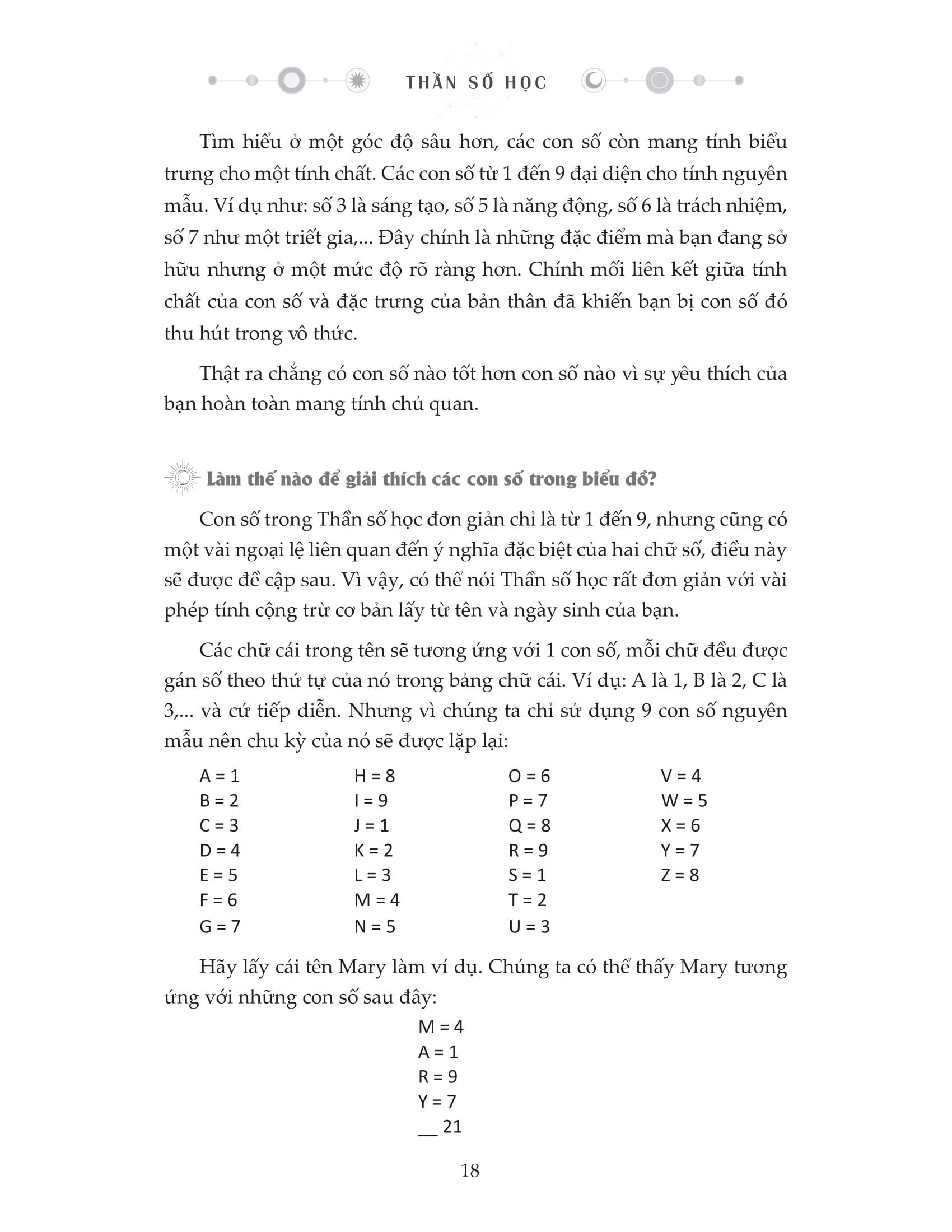 Không có gì là ngẫu nhiên, và những con số cũng vậy. Những con số xuất hiện trong ngày sinh của bạn, xung quanh bạn, trong những giấc mơ,… đều sẽ tiết lộ cho bạn thông tin sâu sắc về tính cách, sứ mệnh, các mối quan hệ và hành trình phát triển của chính bạn. Trong cuốn sách 10 phút tự học Thần số học mỗi ngày, nhà Thần số học Novalee Wilder mang đến một cái nhìn cô đọng về Thần số học phương Tây – từ nguồn gốc cổ xưa đến ứng dụng hiện đại. Bạn sẽ được hướng dẫn từng bước tính toán các chỉ số cốt lõi dựa trên các con số từ 1 đến 9, từ đó khám phá tính cách, hiểu được những bài học cuộc đời quan trọng, xác định mục tiêu cá nhân… cũng như khám phá khái niệm “rung động tên gọi”, công cụ Numeroscope – “vũ khí tối thượng” của một nhà Thần số học. Chỉ cần 10 phút mỗi ngày, bạn sẽ dần làm chủ ngôn ngữ huyền bí của các con số và đón nhận những thông điệp từ vũ trụ. Tham khảo các cuốn sách cùng bộ: 10 phút tự học Tarot mỗi ngày, 10 phút tự học giải mã giấc mơ mỗi ngày.