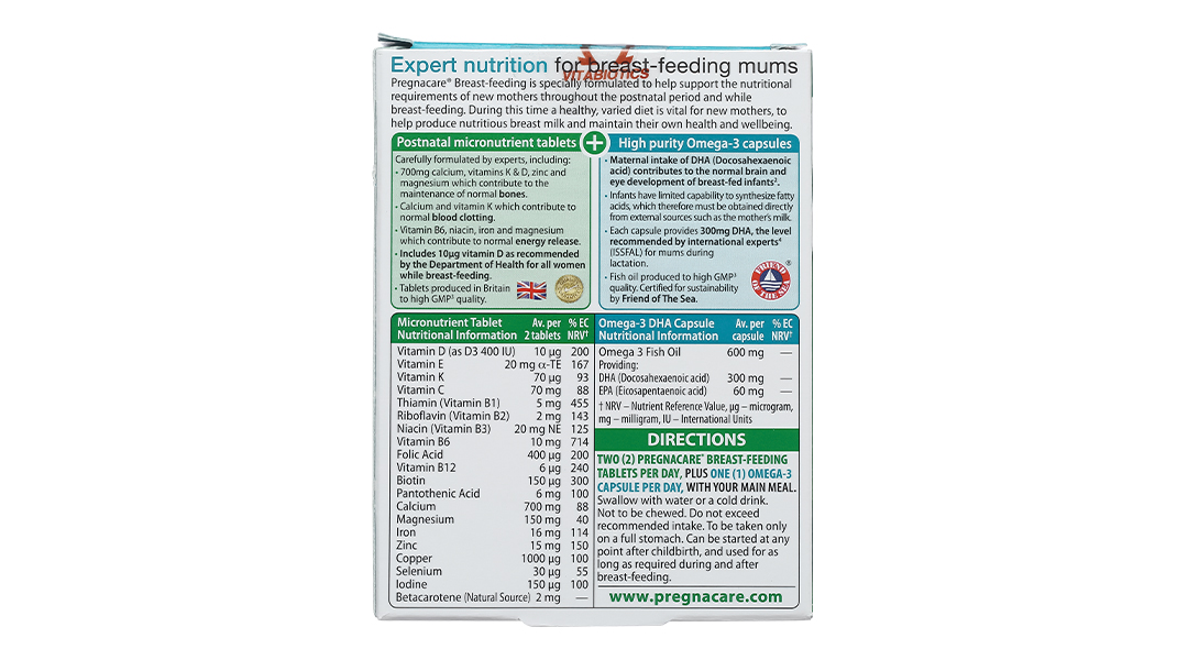 - Có thể dùng trong khoảng 6-9 tháng tính từ sau khi sinh con Thành phần của Pregnacare Breast feeding Hộp gồm 28 viên Omega-3 (viên màu vàng) và 56 viên Pregnacare Breast-feeding (viên màu nâu).