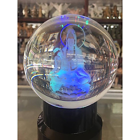 Quả Cầu Pha Lê 3D khắc Quan Thế Âm Bồ Tát ngồi trên đế đèn nhiều màu xoay tự động