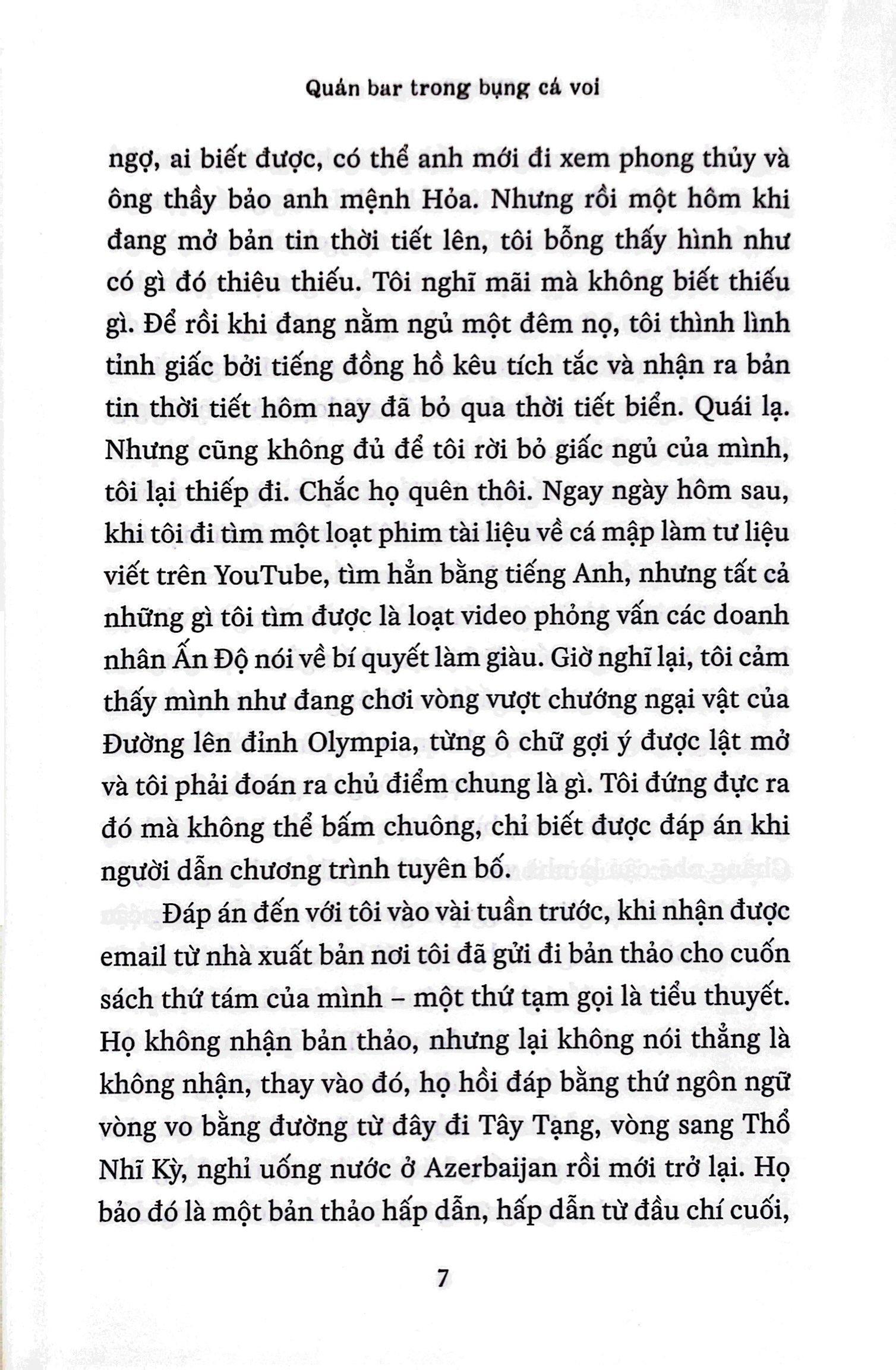 Sau khi bị nhà xuất bản từ chối bản thảo tiểu thuyết mới nhất, một nhà văn nhận ra rằng, trong thế giới cô đang sống, người ta không được quyền nhắc tới "biển". Cô tìm mọi cách để xuất bản cuốn sách của m.ình, và rồi hành trình kỳ lạ mở ra, dẫn cô tới một thư viện nơi những hồn ma thủ thư còn sống mãi, một quán bar như lọt thỏm trong chốn phi-thời-gian, một nhà xuất bản hoạt động trong thế giới ngầm, và những nhà văn không ai rõ danh tính.