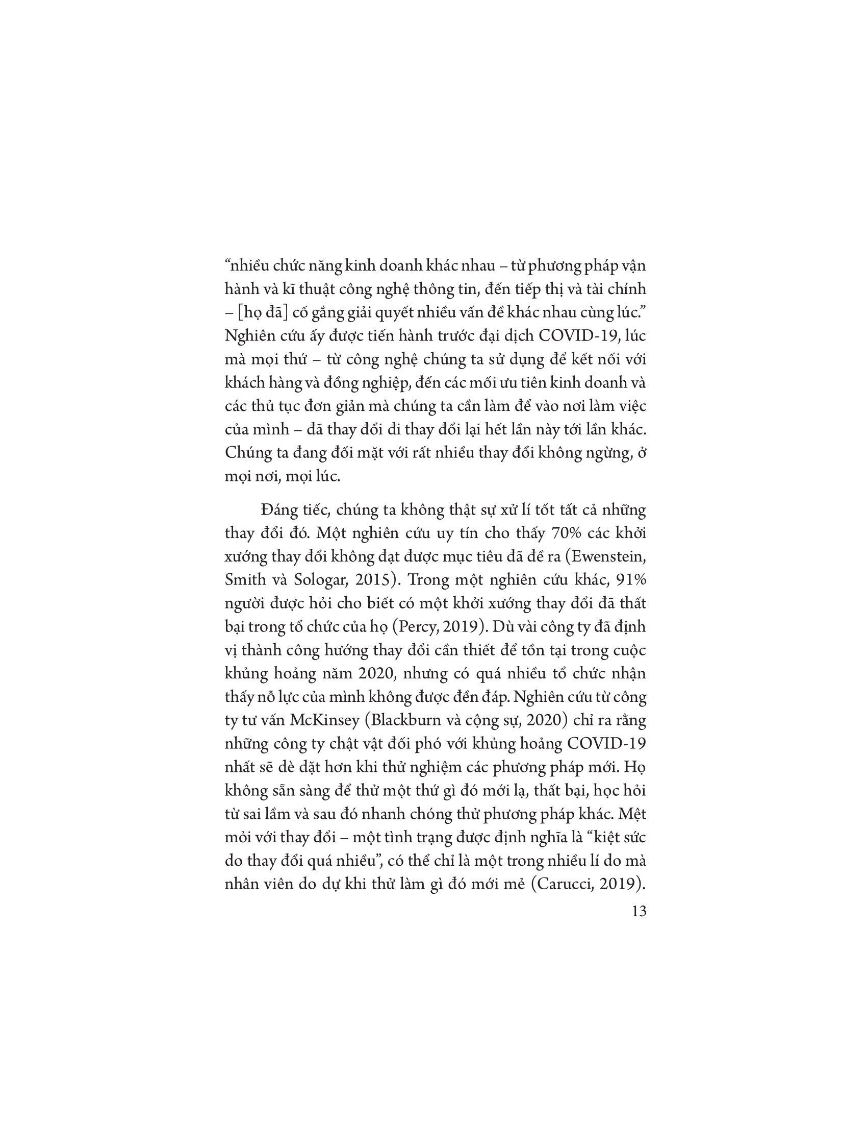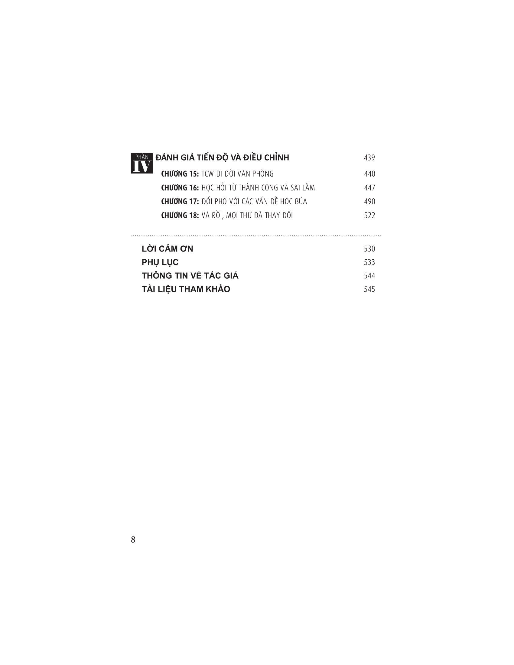 Quản Lí Quy Trình Và Con Người Để Thay Đổi Thành Công Về tác giả Kathryn Zukof có bằng Tiến sĩ về tâm lí xã hội và bằng Thạc sĩ quản trị kinh doanh về tiếp thị. Hiện bà đã có hơn 30 năm kinh nghiệm làm việc và giảng dạy trong lĩnh vực học tập và phát triển tổ chức. Trước đó, bà giữ vai trò xây dựng quan hệ với khách hàng, phát triển sản phẩm và tiếp thị trong lĩnh vực dịch vụ công nghệ. Về cuốn sách Quản Lí Quy Trình Và Con Người Để Thay Đổi Thành Công Trong công việc, và có khi cả trong đời sống cá nhân, chúng ta đều nghe người khác nói rằng chỉ có sự thay đổi là bất biến. Chúng ta đang sống trong một thế giới thiên biến vô cùng, được đặc trưng bởi sự biến động, không thể lường trước. Song rất nhiều lần, những nỗ lực thay đổi của chúng ta lại không đạt được mục tiêu mong muốn. Khách hàng rời đi, có khi còn nhiều hơn trước. Năng suất vẫn như cũ, thậm chí còn sụt giảm. Chúng ta cố gắng tìm hiểu chuyện gì đã xảy ra, m.ình đã bỏ qua điều gì, và chúng ta được bảo rằng kết quả không như mong muốn cũng là chuyện thường tình. Đôi khi những thay đổi ấy có hiệu quả, đôi khi lại không. Vậy tại sao chúng ta vẫn tiếp tục thay đổi? Câu trả lời đơn giản là: chúng ta tiếp tục vì chúng ta phải làm. Cuốn sách đưa ra những phương pháp tiếp cận và công cụ để triển khai, tiếp nhận và quản lí sự thay đổi một cách hiệu quả. Cụ thể, tác giả chỉ ra rằng cần quản lí quy trình (mặt cứng) và con người (mặt mềm) của sự thay đổi và tìm ra điểm cân bằng tốt nhất giữa hai bên. Khi tích hợp cả hai, các tổ chức có thể quản lí sự thay đổi thành công và đạt được kết quả mong muốn. Đây chắc chắn là một cuốn cẩm nang hữu ích về điều hành, quản lí doanh nghiệp mà bất cứ doanh nhân nào cũng nên đọc một lần trong đời.
