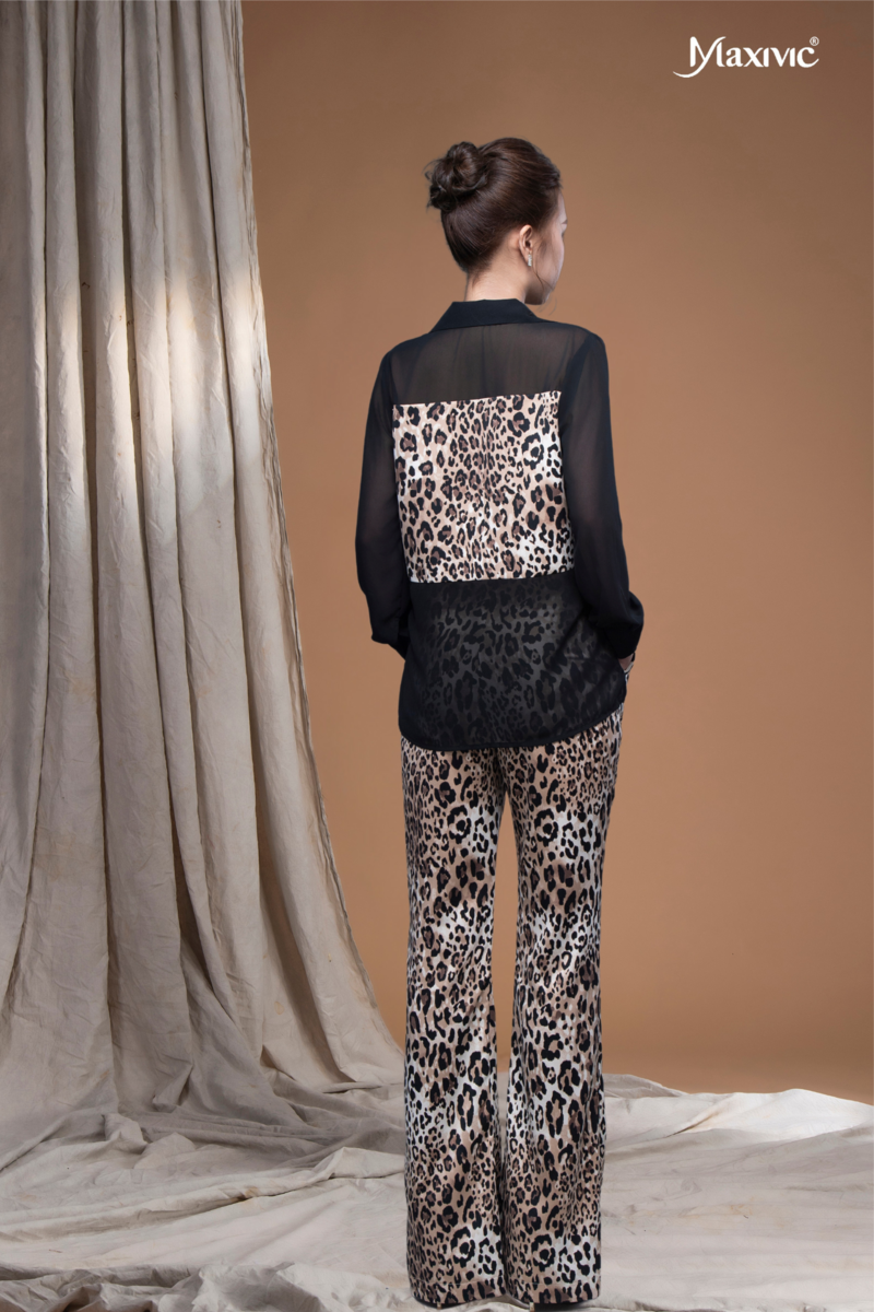 - Chất liệu: Vải lụa cát Hàn Quốc - Quần ống loe nhẹ, lưng cao hoạ tiết da beo giúp che khuyết điểm tốt, mang lại sự thanh lịch và thoải mái cho người mặc.