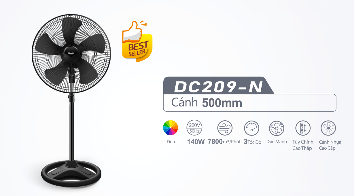Quạt đứng công nghiệp HALI DC-209C - Công suất: 140W (220V - 50Hz) - Đường kính cánh: 500mm - Cánh nhựa ABS - Chuyển hướng cơ - Lưu lượng gió: 130m3/Phút - Tốc độ gió: 3 tốc