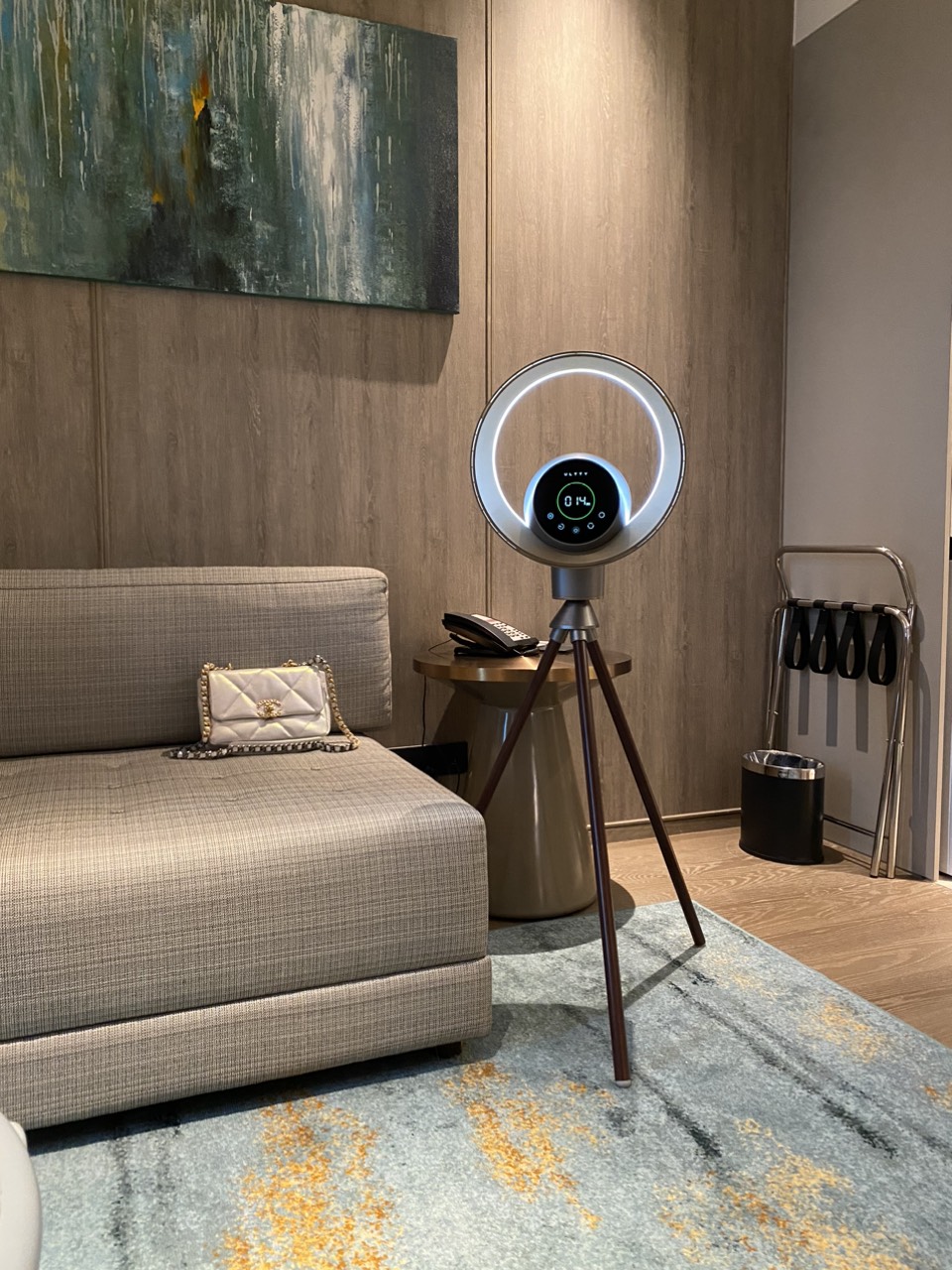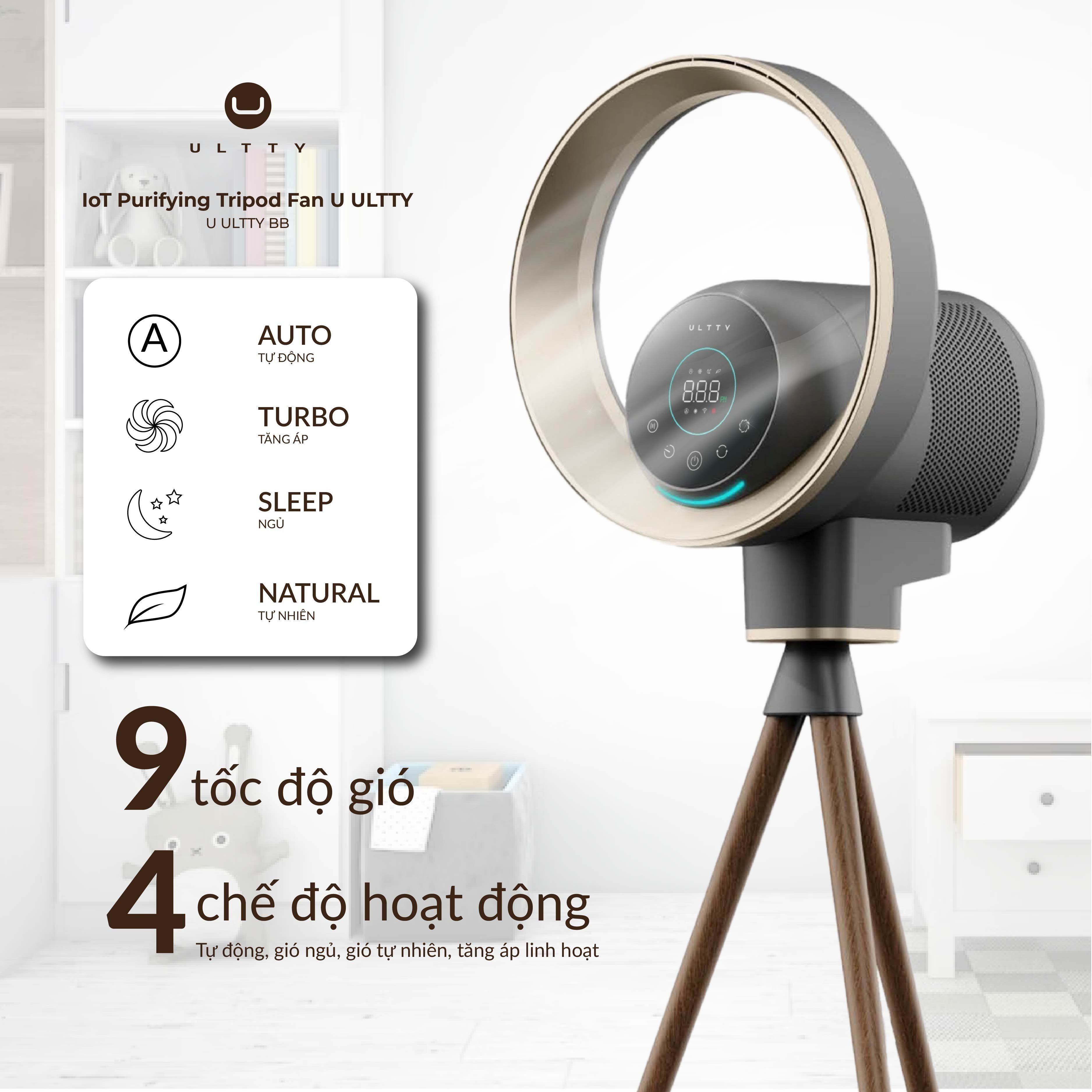 ULTTY BB sử dụng đèn khí quyển học vòng tròn bo xung quanh viền quạt. Giúp thẩm Mỹ sang trọng, đồng thời kết hợp làm đèn ngủ, đen trang trí, sử dụng hoàn toàn độc lập với các chức năng khác
