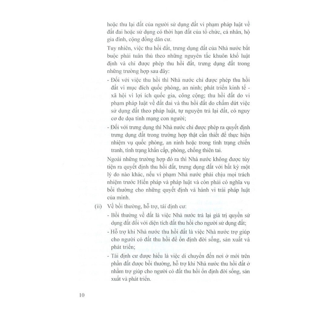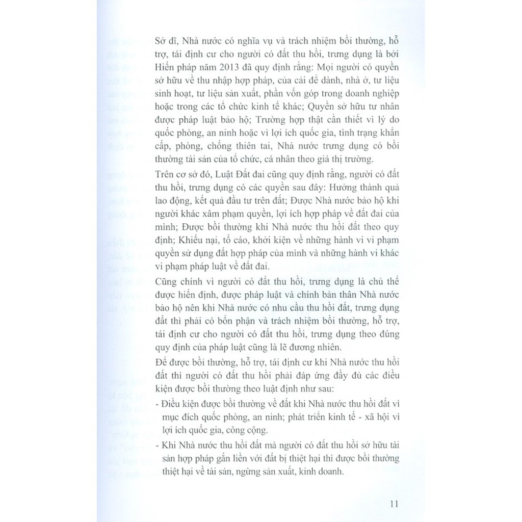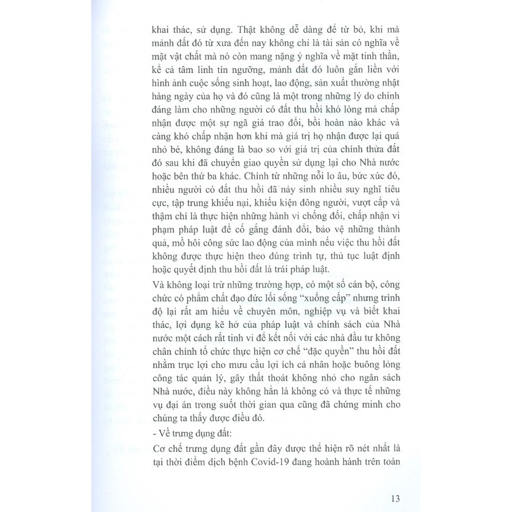 Thu hồi đất, trưng dụng đất, bồi thường, hỗ trợ, tái định cư là một chế định đặc biệt quan trọng của pháp luật về đất đai hiện nay, thậm chí là qua các thời kỳ phát triển đất nước kể từ lần đầu tiên Luật Đất đai của Quốc hội số 3-LCT/HĐNN8 ngày 29/12/1987 được thông qua và có hiệu lực thi hành vào ngày 08/1/1988. Đến nay, chế định thu hồi đất, trưng dụng đất, bồi thường, hỗ trợ, tái định cư cơ bản đã dần hoàn thiện thông qua Luật Đất đai năm 2013 cùng với đó là các Nghị định của Chính phủ và các Thông tư hướng dẫn thi hành chi tiết của các Bộ, ngành Trung ương tạo được hành lang pháp lý áp dụng thực hiện công tác thu hồi đất, trưng dụng đất, bồi thường, hỗ trợ, tái định cư được phần nào thuận lợi, dễ dàng hơn. Đối với tình hình tại các địa phương hiện nay, việc áp dụng chế định này cũng đang được coi là một nhiệm vụ trọng tâm, then chốt và luôn ưu tiên đặt lên hàng đầu của cả hệ thống chính trị từ các cấp ủy đảng đến các cấp chính quyền địa phương và đoàn thể xã hội. Từ đó, chúng ta thấy được chế định này hết sức đặc biệt, bởi nó tác động trực tiếp và chi phối mạnh mẽ đến hầu hết tất cả các lĩnh vực của đời sống kinh tế - chính trị - xã hội và luôn nhận được sự quan tâm từ mọi tầng lớp nhân dân. Tuy nhiên, thực tiễn thực thi đối với chế định này đã bộc lộ nhiều hạn chế yếu kém, bất cập và phát sinh nhiều hệ lụy khó lường trong các trường hợp phải thu hồi đất, trưng dụng đất; đối tượng bị thu hồi, trưng dụng cho đến việc xác định điều kiện bồi thường, hỗ trợ, tái định cư và giá trị bồi thường về đất, bồi thường thiệt hại về tài sản, sản xuất, kinh doanh cùng với đó là chính sách hỗ trợ, tái định cư về việc di chuyển chỗ ở, sản xuất, kinh doanh và giải quyết việc làm, đảm bảo đời sống cơ bản còn gây nhiều bức xúc trong nhân dân dẫn đến câu chuyện phát sinh nhiều hệ lụy xã hội về khiếu nại, khiếu kiện dai dẳng kéo dài nhiều năm, thậm chí là nhiều thập kỷ vẫn chưa được giải quyết một cách thỏa đáng, thấu tình đạt lý làm cho tình hình chính trị - xã hội ngày trở nên bất ổn, phức tạp, diễn biến khó lường và khó kiểm soát. Nguyên nhân sâu xa xuất phát từ cơ chế phối hợp giữa Nhà nước, nhà đầu tư và người dân chưa tạo được sự thống nhất cao, còn bất đồng về cách hiểu và cách vận dụng đối với chế định này. Hơn nữa, vấn đề thực thi công vụ của nhiều cơ quan, tổ chức, cá nhân có thẩm quyền cũng cần phải được xét đến trong việc nhận thức pháp luật tại nhiều nơi chưa đồng đều dẫn đến việc vận dụng và xử lý chưa thật sự linh hoạt, khéo léo với những tình huống “nóng” và “nhạy cảm” phát sinh; chế độ công khai thông tin nhiều nơi còn mập mờ, thiếu minh bạch; chưa đảm bảo được quyền lợi tốt nhất cho người dân và sự tham gia giám sát của cộng đồng theo luật định. Do vậy, cuốn sách này ra đời nhằm mong muốn mang đến cho quý độc giả một cách nhìn tổng quan dưới góc nhìn pháp lý về công tác thu hồi đất, trưng dụng đất, bồi thường, hỗ trợ, tái định cư, giải quyết hệ quả khiếu nại, khiếu kiện vượt cấp, kéo dài khi Nhà nước thu hồi đất, trưng dụng đất nhằm hướng một sự nhận thức chung về pháp luật, góp phần tạo nên sự đồng đều, thống nhất cao trong cách hiểu và đồng thuận cao trong hành động thông qua các quy trình pháp lý được thiết lập sau đây: Quy trình thu hồi đất, trưng dụng đất, bồi thường, hỗ trợ, tái định cư; Quy trình phát triển dự án nhà ở để bố trí tái định cư; Quy trình giải quyết khiếu nại; Quy trình giải quyết tố cáo và Quy trình khởi kiện vụ án hành chính tại Tòa án có thẩm quyền.