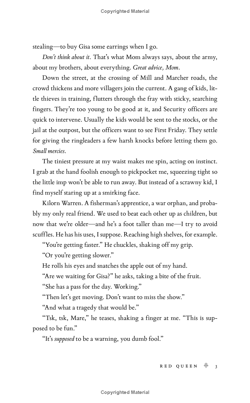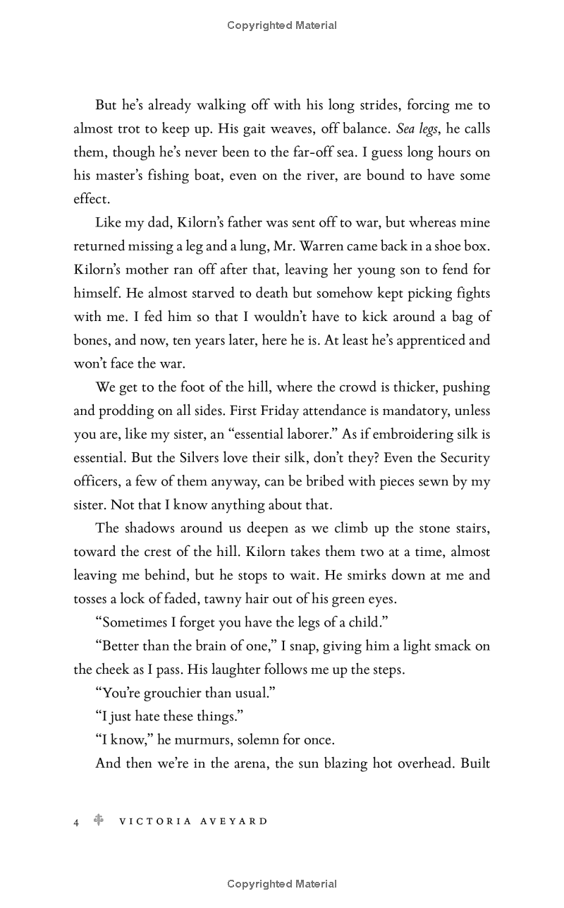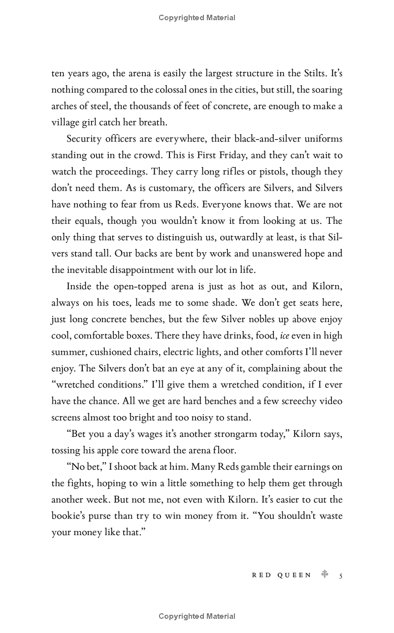Fearful of Mare's potential, the Silvers hide her in plain view, declaring her a long-lost Silver princess, now engaged to a Silver prince. Despite knowing that one misstep would mean her death, Mare works silently to help the Red Guard, a militant resistance group, and bring down the Silver regime.