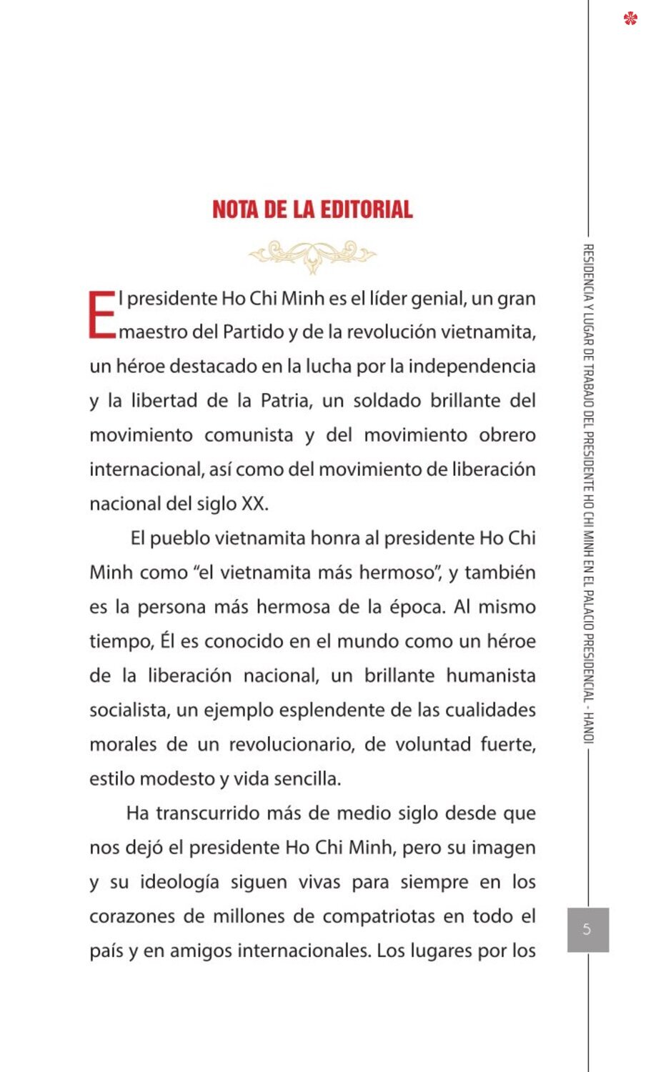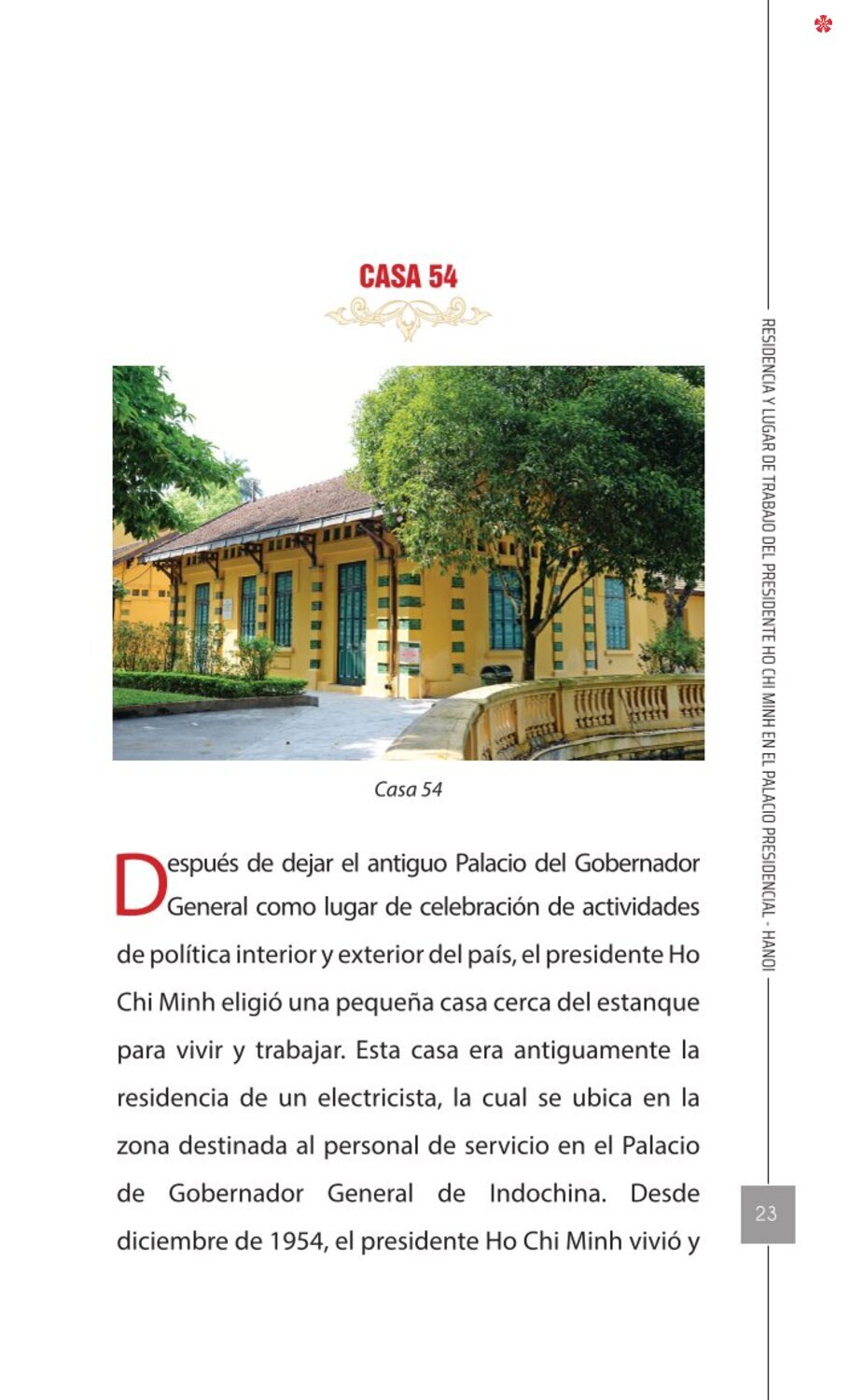 El libro Residencia y lugar de trabajo del presidente Ho Chi Minh en el Palacio Presidencial - Hanoi ofrece a los lectores un recurso valioso que nos ayuda a comprender mejor la vida del amado líder del de la nación vietnamita. El libro recrea de forma realista y lleva al lector a cada pequeño rincón, a cada recuerdo, a cada historia sencilla pero impregnada de significado histórico y humano sobre los lugares asociados al presidente Ho Chi Minh en el Palacio Presidencial como: la Casa 54, la Casa sobre pilotes, la Casa 67, el estanque de peces, el camino de mangos, lentre otros.
