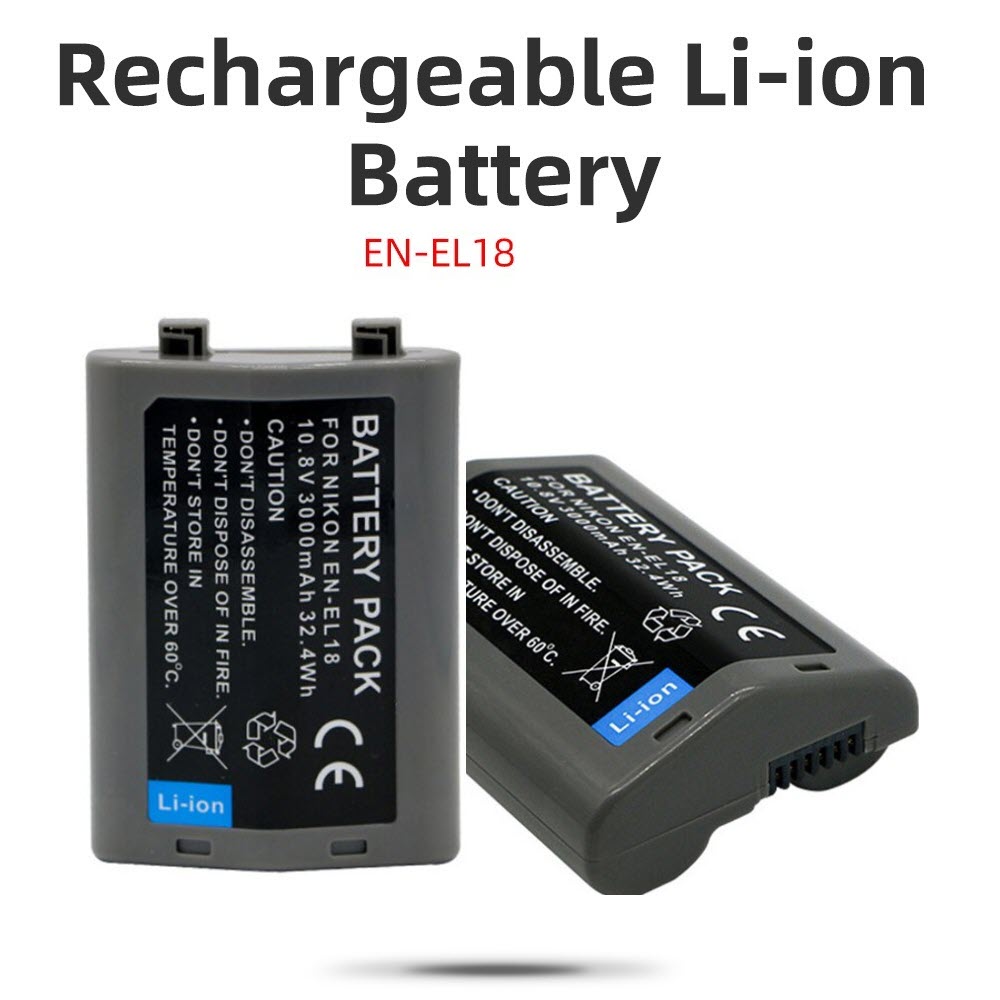 - Pin EN-EL18 3000mAh cung cấp năng lượng lâu dài cho các máy ảnh Nikon tương thích.