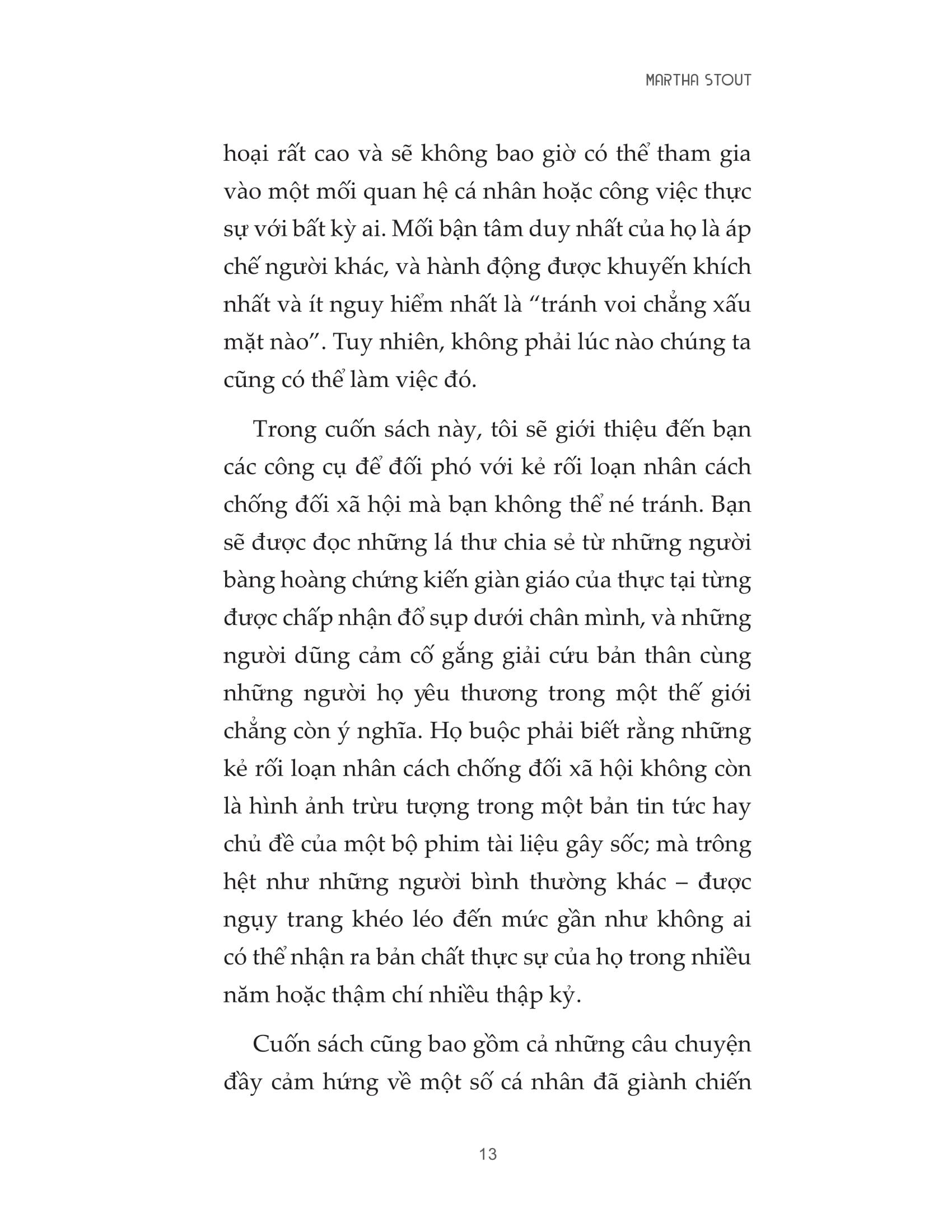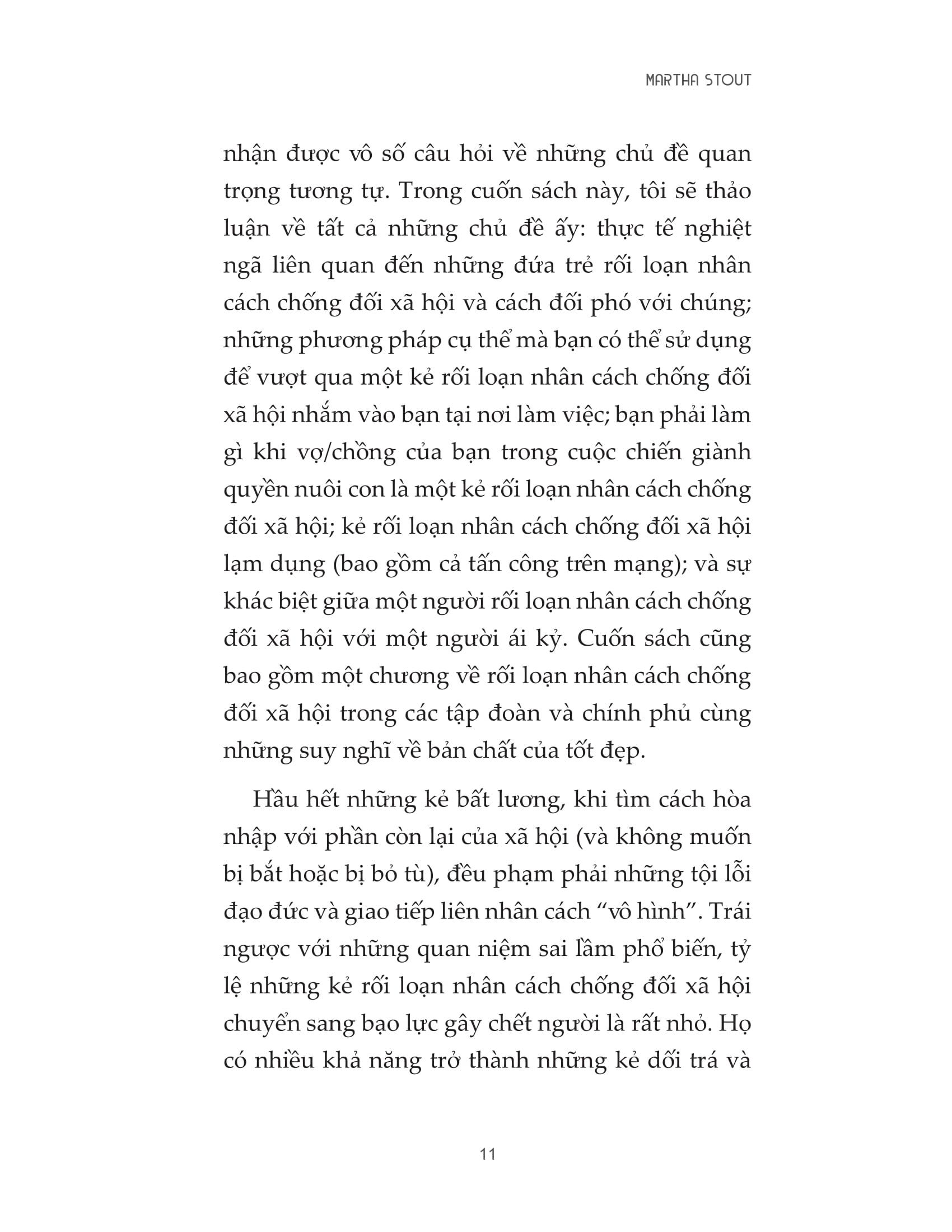 Martha Stout, Ph.D. Giảng viên tâm lý học của khoa Tâm thần học tại Trường Y Harvard trong 25 năm, cộng sự lâm sàng tại Bệnh viện Đa khoa Massachusetts ở Boston. Là tác giả của nhiều cuốn sách như The Sociopath Next Door, The Paranoia Switch, The Myth of Sanity.
