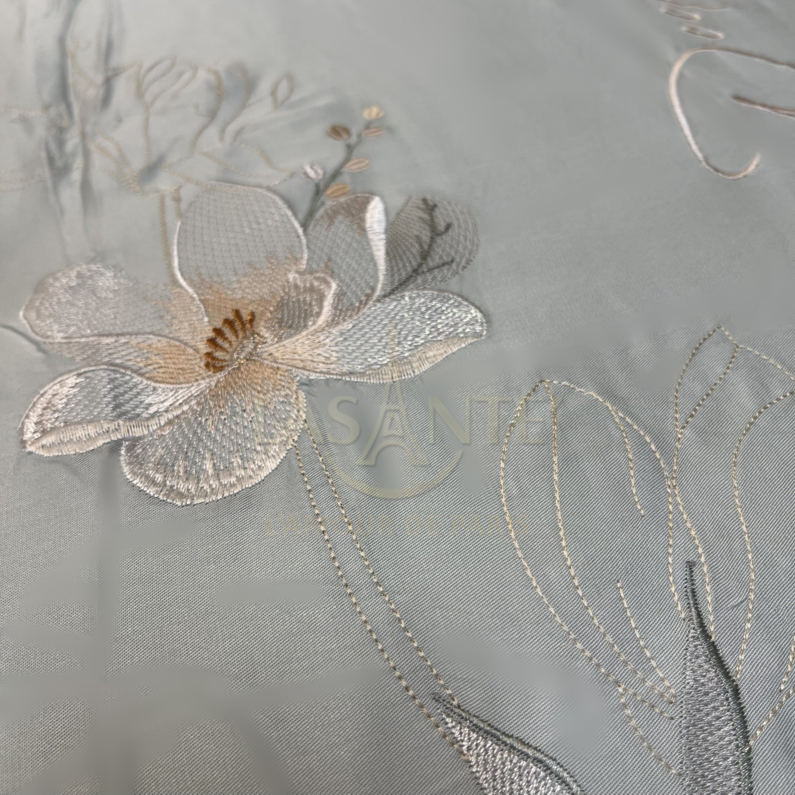 Chất liệu: Tencel. Xuất xứ : Việt Nam. Họa tiết hoa loa kèn nhỏ kết hợp cùng hoa văn cô điển được thêu màu chỉ nâu nhạt trên nền vải Tensen màu vàng mỡ gà,đây