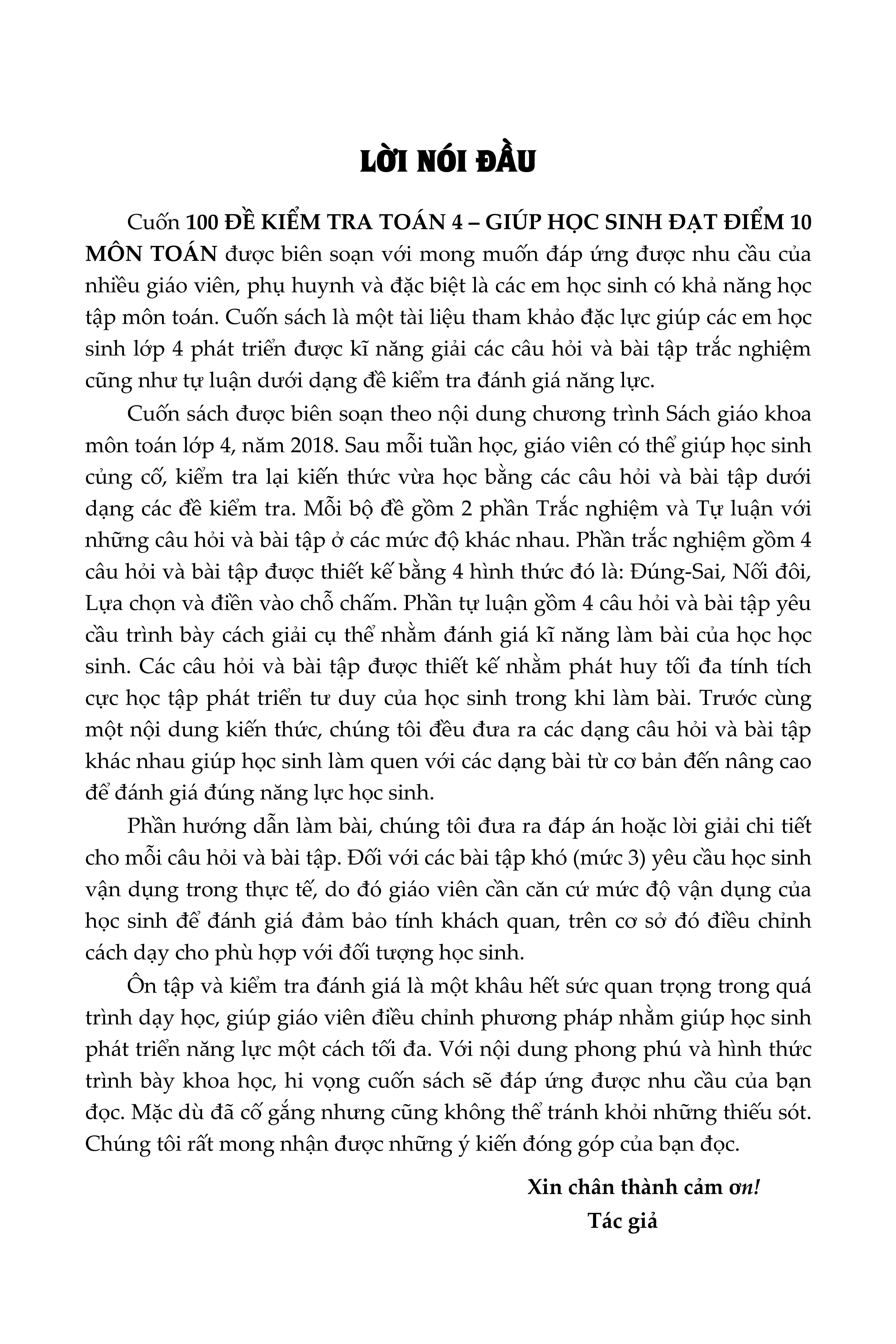 Trên thực tế, việc kiểm tra đánh giá kết quả học tập của học sinh ở nhiều trường còn phiến diện, chưa bám sát mục tiêu giáo dục và chuẩn kiến thức, kĩ năng. Để giúp các giáo viên, học sinh có tài liệu tham khảo và thử nghiệm, chúng tôi biên soạn bộ sách “100 đề kiểm tra Toán 4” các đề kiểm tra trong mỗi cuốn sách đều được biên soạn theo đúng yêu cầu kiến thức, kĩ năng của Bộ Giáo dục và Đào tạo.