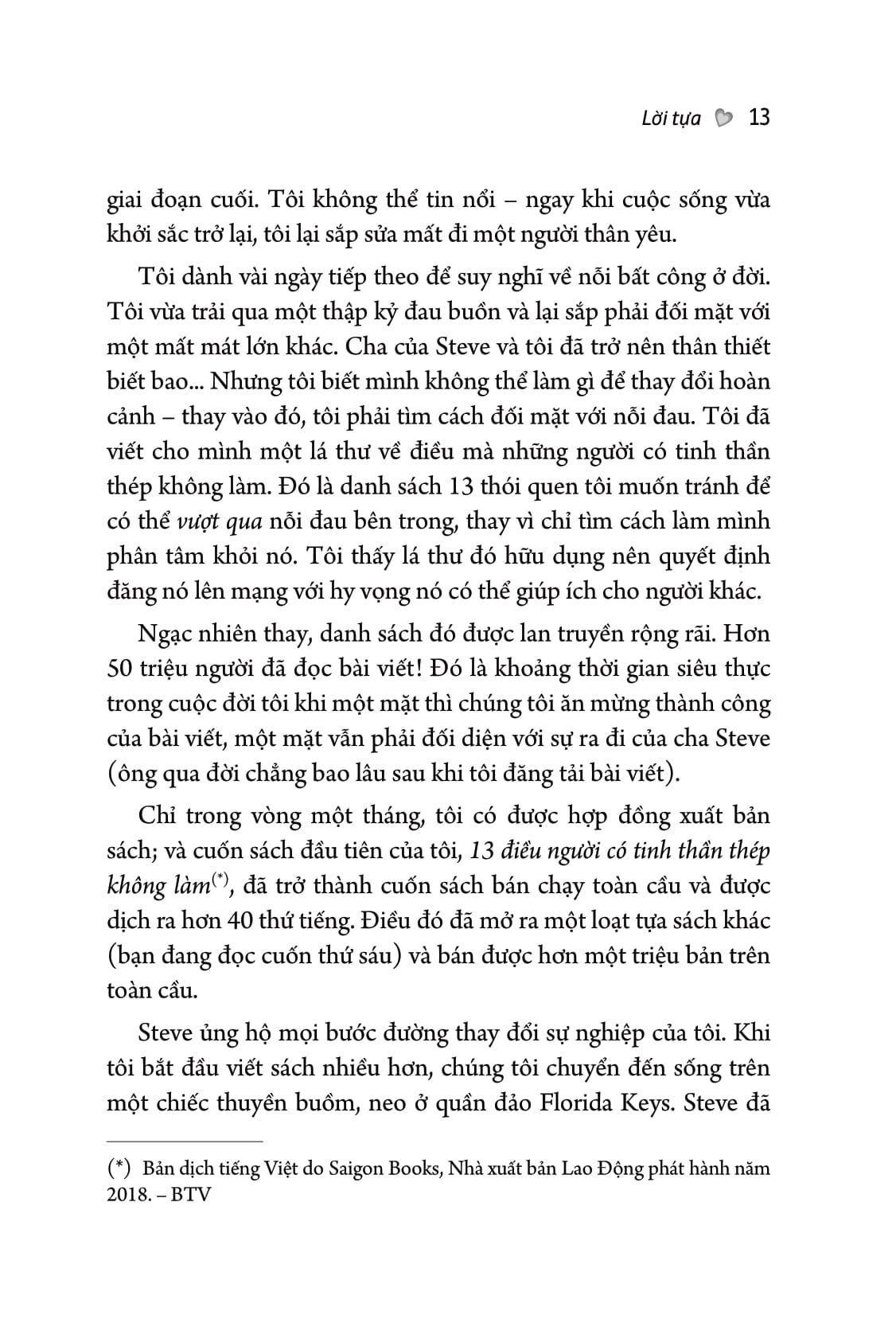 Theo khảo sát được Amy Morin thực hiện năm 2023 với hơn 1.000 cặp đôi, 86% người được hỏi cho biết họ mong muốn củng cố mối quan hệ – và phần lớn tin rằng điều đó khả thi nếu họ xây dựng được sức mạnh tinh thần. Cuốn sách này là một cẩm nang để bạn bắt đầu từ chính m.ình, bước đầu tiên để yêu một cách bền vững và đủ vững vàng cho cả hai.