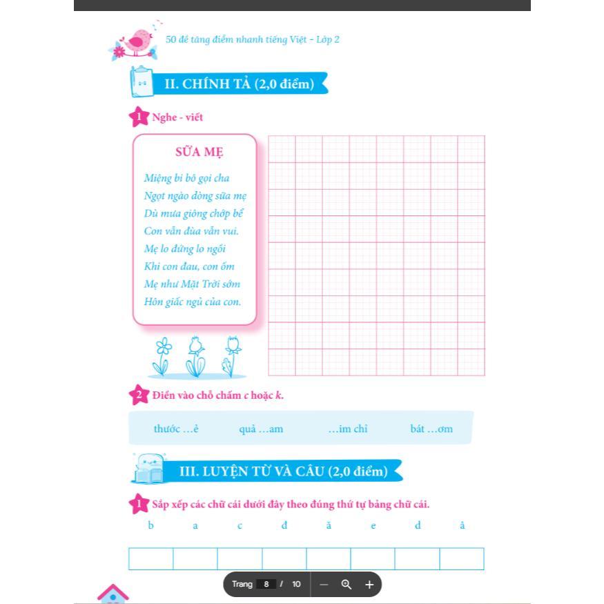Cuốn sách 50 Đề Tăng Điểm Nhanh Tiếng Việt Lớp 2 bao gồm 4 phần chính: