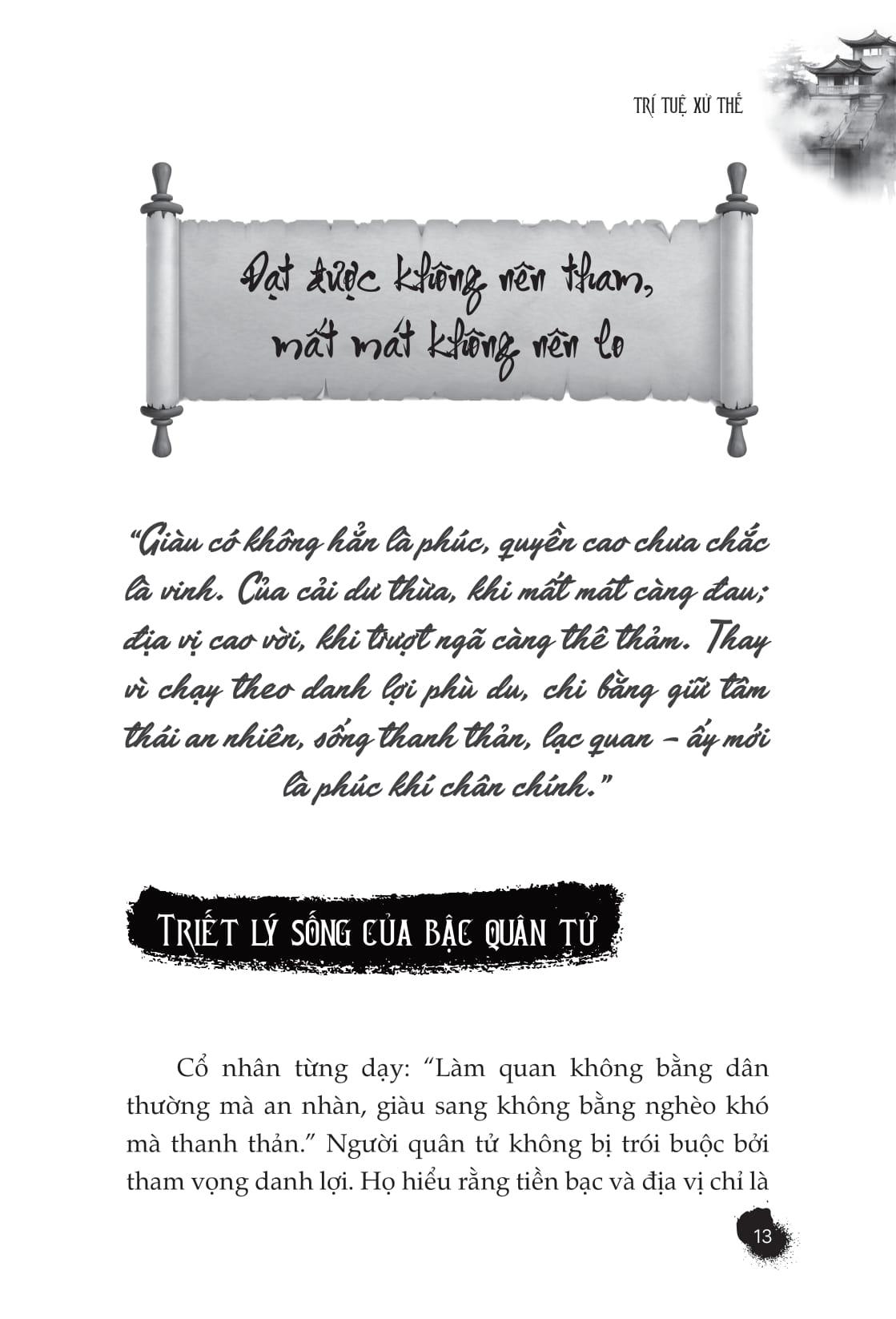 - Làm chủ bản thân, thản nhiên trước được mất: Sách giúp người đọc nhận ra rằng danh lợi, quyền lực chỉ là phù du, và sự thanh thản trong tâm hồn mới là điều đáng quý.