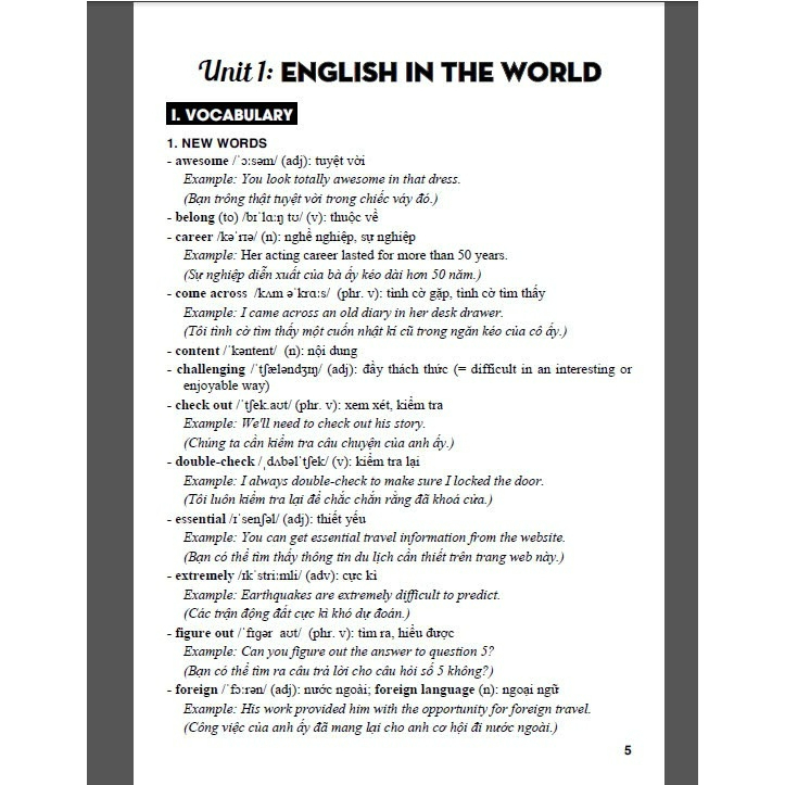 I. Vocabulary: giải thích ý nghĩa những từ mới trong mỗi Unit; có nhiều ví dụ minh họa để học sinh nắm vững cách dùng từ.