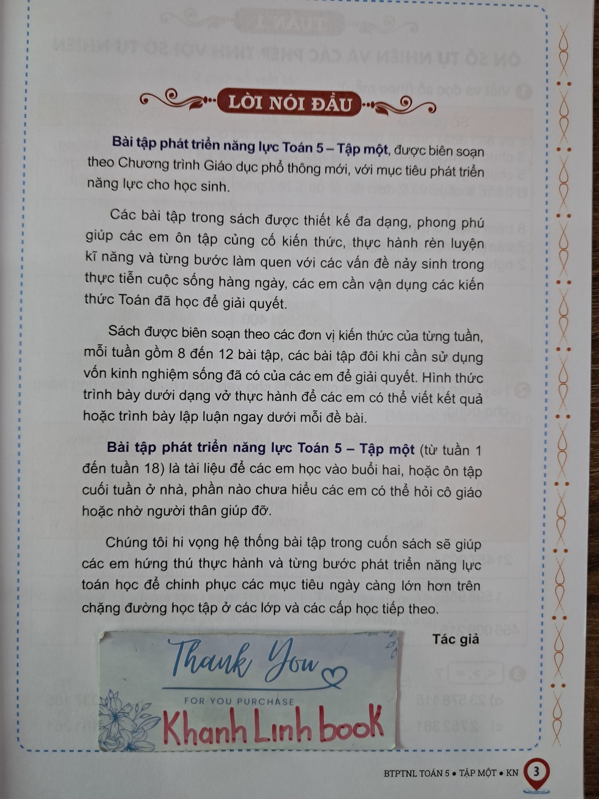 Sách - Bài tập Phát triển năng lực toán 5 - tập 1 (BM) (từ tuần 1 đến tuần 18) là tài liệu để các em học vào buổi hai hoặc ôn tập cuối tuần ở nhà, phần nào chưa hiểu các em có thể hỏi thầy cô giáo hoặc nhờ người thân giúp đỡ.