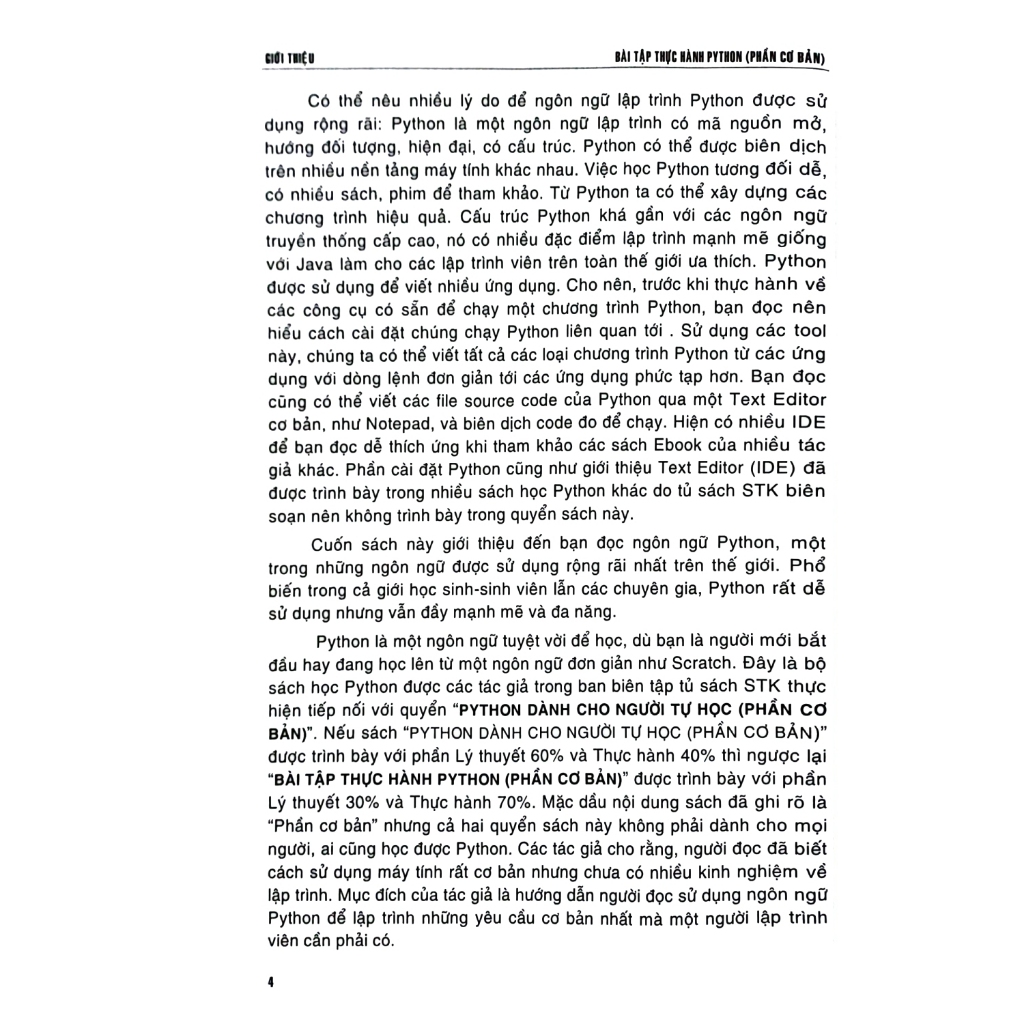 Cuốn sách này giới thiệu đến bạn đọc ngôn ngữ Python, một trong những ngôn ngữ được sử dụng rộng rãi nhất trên thế giới. Phổ biến trong cả giới học sinh-sinh viên lẫn các chuyên gia, Python rất dễ sử dụng nhưng vẫn đầy mạnh mẽ và đa năng. Python là một ngôn ngữ tuyệt vời để học, dù bạn là người mới bắt đầu hay đang học lên từ một ngôn ngữ đơn giản như Scratch. Đây là bộ sách học Python thực hiện tiếp nối với quyển “PYTHON DÀNH CHO NGƯỜI TỰ HỌC (PHẦN CƠ BẢN)”. Nếu sách “PYTHON DÀNH CHO NGƯỜI TỰ HỌC (PHẦN CƠ BẢN)” được trình bày với phần Lý thuyết 60% và Thực hành 40% thì ngược lại “BÀI TẬP THỰC HÀNH PYTHON (PHẦN CƠ BẢN)” được trình bày với phần Lý thuyết 30% và Thực hành 70%. Mặc dầu nội dung sách đã ghi rõ là “Phần cơ bản” nhưng cả hai quyển sách này không phải dành cho mọi người, ai cũng học được Python. Các tác giả cho rằng, người đọc đã biết cách sử dụng máy tính rất cơ bản nhưng chưa có nhiều kinh nghiệm về lập trình. Mục đích của tác giả là hướng dẫn người đọc sử dụng ngôn ngữ Python để lập trình những yêu cầu cơ bản nhất mà một người lập trình viên cần phải có.