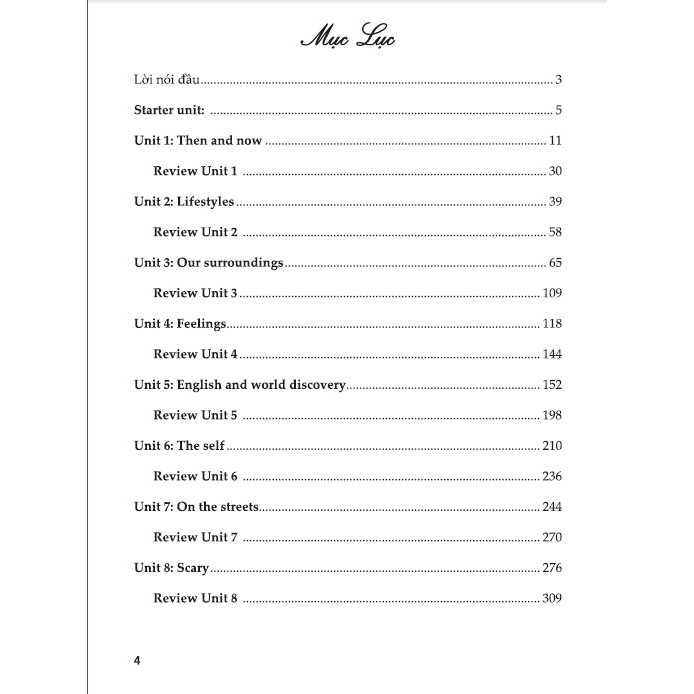 Bài tập Tiếng Anh 9 – Không đáp án gồm một bài ôn tập củng cố kiến thức đã học (Starter Unit), và 8 đơn vị bài học chính: Then and now; Lifestyles; Our surroundings; Feelings; English and world discovery; The self; On the streets; Scary. Sau mỗi đơn vị bài học đều có bài ôn tập Review. Bài tập dành cho mỗi đơn vị bài học chính gồm 6 phần: Vocabulary,