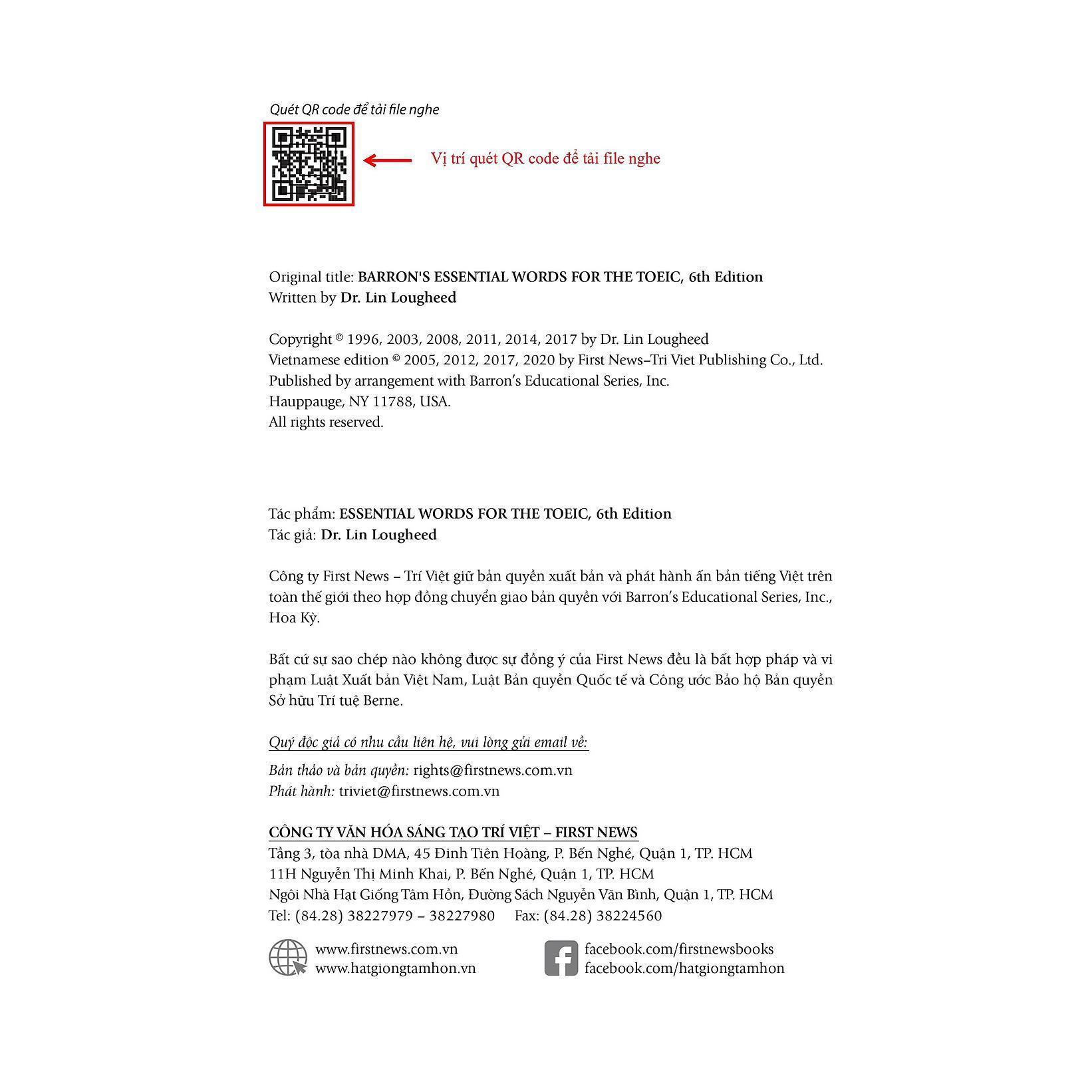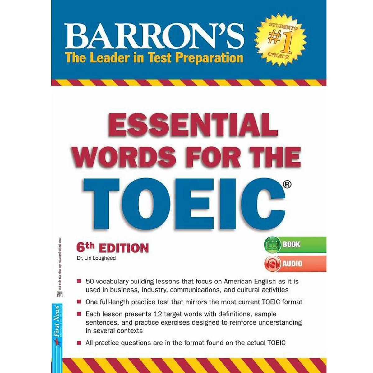 Essential words for TOEIC (Tái bản lần thứ 6) là cuốn sách giúp người học xây dựng vốn từ vựng, tập trung vào 600 từ vựng Anh - Mỹ thường xuất hiện trong kỳ thi TOEIC. Từ vựng và cách dùng từ là những gì mà quyển sách này hướng đến để giúp bạn chuẩn bị tốt cho kỳ thi TOEIC (Kỳ thi Trắc nghiệm tiếng Anh trong giao tiếp quốc tế). Đây là kỳ thi nhằm đánh giá trình độ tiếng Anh của những người làm việc trong lĩnh vực kinh doanh quốc tế, hoặc dự định sử dụng tiếng Anh để giao tiếp. Dù kỳ thi TOEIC không nhằm trắc nghiệm vốn từ chuyên môn nhưng các câu hỏi trong bài thi đều nằm trong những ngữ cảnh đặc trưng. Quyển sách này sẽ giúp bạn nắm vững những ngữ cảnh đặc trưng thường gặp trong bài thi TOEIC. Mỗi chương giới thiệu một ngữ cảnh cụ thể đã từng có trong bài thi. Những từ mới được giới thiệu trong mỗi chương đều nằm trong vốn từ vựng thông dụng nên có thể được dùng trong nhiều ngữ cảnh khác nhau. Nhờ đó, bạn sẽ dễ dàng nắm được nghĩa của những từ này trong những ngữ cảnh của đề thi TOEIC. Ở phần cuối sách, giới thiệu một đề thi TOEIC mẫu để bạn có cơ hội ôn luyện vốn từ vựng theo ngữ cảnh của đề thi TOEIC. Đây là đề thi đúng chuẩn TOEIC với những dạng câu hỏi cũ và bổ sung một số dạng câu hỏi mới đang bắt đầu được sử dụng ở một vài quốc gia. Ngoài nội dung chính cuốn sách còn hướng dẫn cách sử dụng khoa học, dễ hiểu và hiệu quả. Bao gồm 50 bài học, trong mỗi bài học, bạn sẽ học được 12 từ mới qua từng ngữ cảnh cụ thể. Nếu bạn học mỗi ngày một bài, thì sau 50 ngày, bạn sẽ học thêm được 600 từ mới. Bạn sẽ luyện tập những từ mới học bằng cách làm các bài tập được mô phỏng giống như bài thi TOEIC. Ở trang đầu của mỗi bài học, bạn sẽ thấy một khung chữ nhật - phần danh mục từ, trong đó có 12 từ vựng. Mỗi từ sẽ có định nghĩa và hai câu ví dụ có chứa từ đó trong 2 ngữ cảnh khác nhau. Mục đích của trang này là giúp: