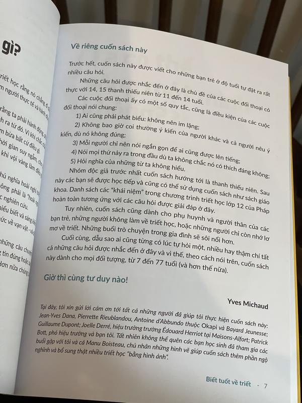Sau mỗi cuộc đối thoại, Yves Michaud mở rộng vấn đề với những ví dụ cụ thể và thông tin về các nhà tư tưởng nổi tiếng, dẫn dắt bạn đọc tư duy sâu hơn. Suy ngẫm triết học hướng đến giải phóng và tự do, kích thích trí tưởng tượng và mở cánh cửa đến với tri thức về vạn vật. Biết tuốt về triết là cuốn sách giúp bạn làm quen với triết và hiểu rằng với triết học, tuổi tác không quan trọng!