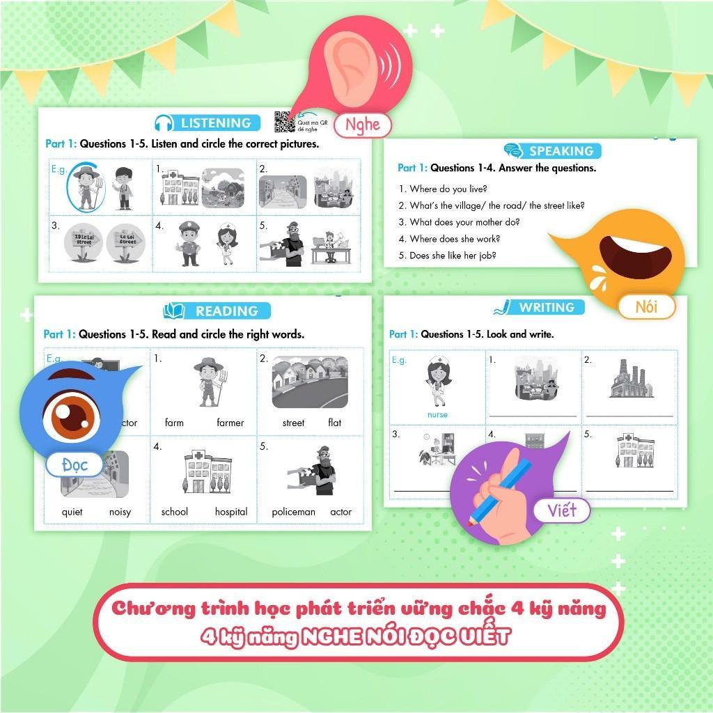 - Bài kiểm tra Sau mỗi 2 bài học sẽ có 2 bài kiểm tra được thiết kế dựa trên nội dung từ vựng và cấu trúc của 2 bài học đó, giúp kiểm tra toàn diện kiến thức và 4 kỹ năng nghe - nói - đọc - viết, bám sát theo Chương trình Giáo dục phổ thông mới của Bộ GD&ĐT. Sau 5 bài sẽ có 2 bài kiểm tra tổng hợp, kiểm tra lại toàn bộ kiến thức của 5 bài học trước đó với đa dạng các bài tập 4 kỹ năng. Sau 10 bài học sẽ là bài kiểm tra cuối học kỳ để kiểm tra lại toàn bộ các kiến thức từ vựng và cấu trúc các em đã học sau một kỳ học. Tất cả các bài kiểm tra đều được thiết kế theo thông tư mới nhất của Bộ GD&ĐT, vận dụng cả 4 kỹ năng nghe – nói – đọc – viết, thầy cô giáo cũng như bố mẹ sẽ dễ dàng kiểm tra, đánh giá được năng lực của các con.