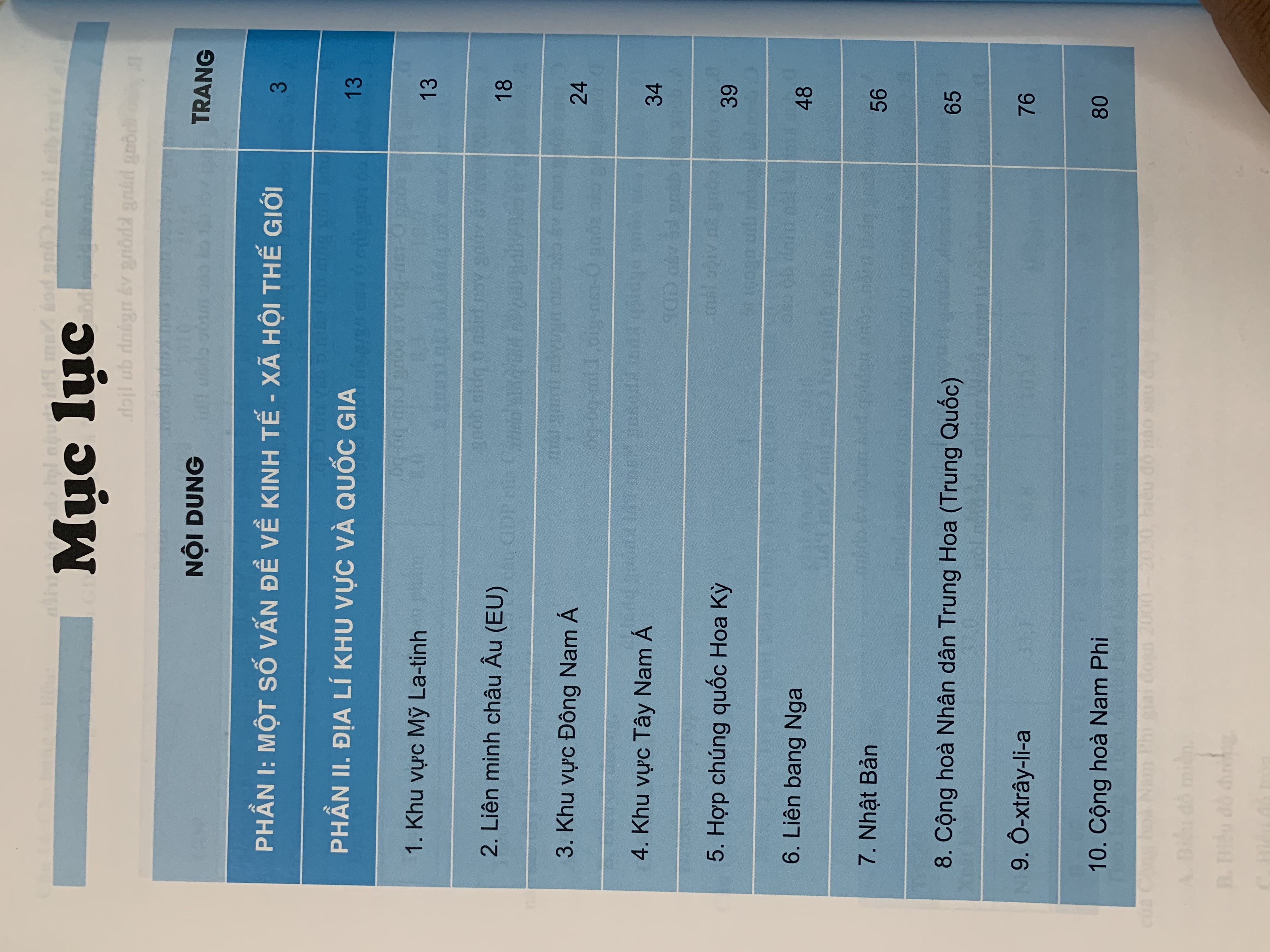 Phần II: Địa lí khu vực và quốc gia, gồm các nội dung: Khu vực Mỹ La-tinh; Liên minh châu Âu (EU); Khu vực Đông Nam Á; Khu vực Tây Nam Á; Hợp chúng quốc Hoa Kỳ; Liên bang Nga; Nhật Bản; Cộng hoà Nhân dân Trung Hoa (Trung Quốc); Ô-xtrây-li-a; Cộng hoà Nam Phi.