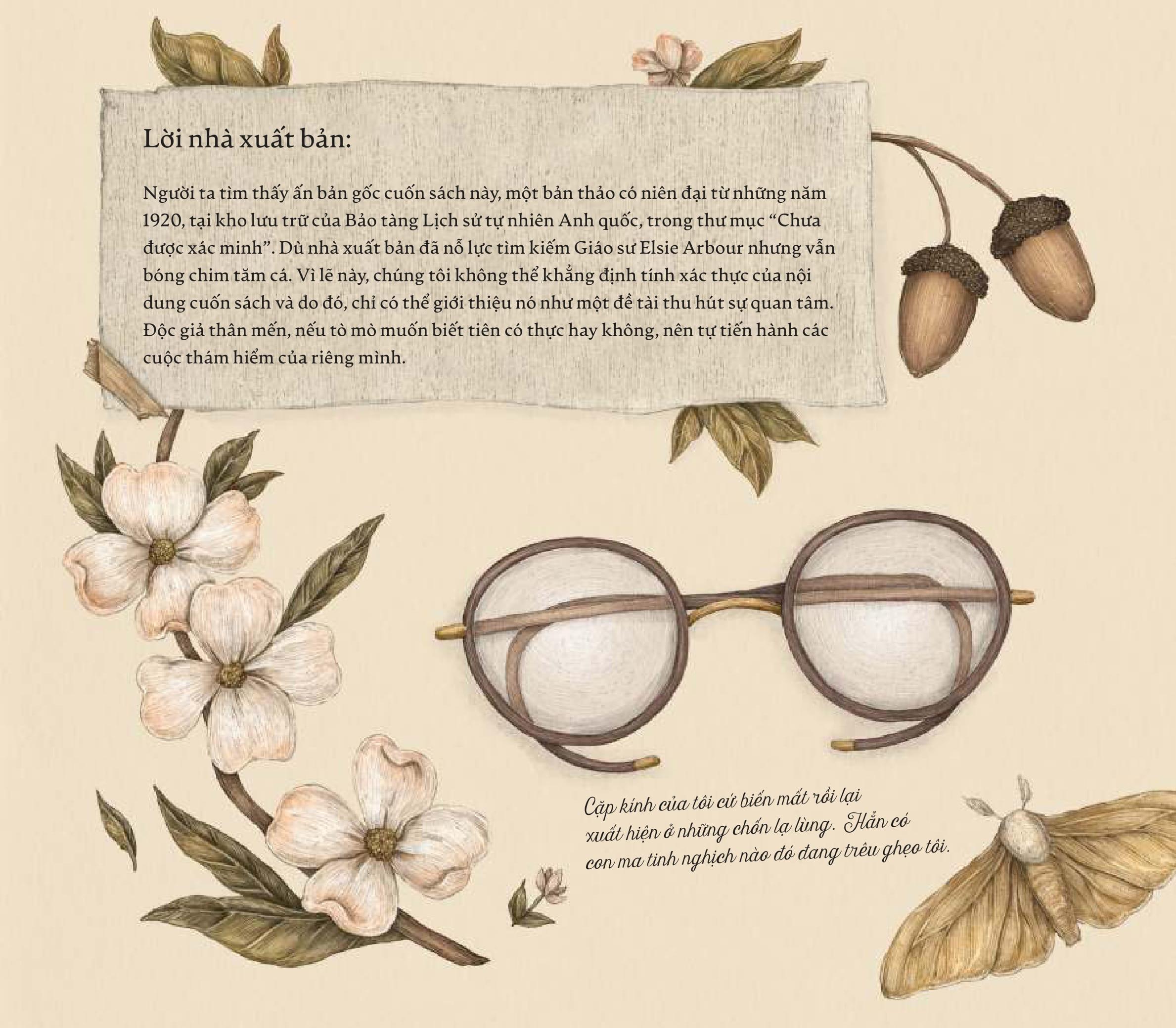 Mua tại TiktokCẩm Nang Về Tiên Bạn đọc thân mến, Bạn đã sẵn sàng cho chuyến hành trình có một không hai chưa? Vậy hãy lật giở cuốn sách này ngay thôi nào! Tiên có thật và hiện diện quanh ta, chỉ cần bạn nhanh trí, tinh mắt và đủ may mắn để trông thấy những tạo vật kì diệu này trong vườn nhà hay trên gác xép mà thôi. Biên soạn bởi nhà thực vật học lẫy lừng – Giáo sư Elsie Arbour, cuốn cẩm nang kì công này được bà gửi tới cháu gái nhằm giúp cô khám phá đời sống bí mật của các loài tiên cũng như vai trò của họ trong thế giới tự nhiên. Tập hợp nhiều ghi chú thực địa chính xác và minh họa cầu kì, từng trang sách tiết lộ đa dạng các loài tiên khác nhau trên khắp đ.ịa cầu, đi sâu phân tích đặc điểm nhận dạng, môi trường sống, tập tính và cả ngôn ngữ bí ẩn của họ. Bạn chắc chắn sẽ phải kinh ngạc trước thế giới các loài tiên siêu sống động và thú vị đấy!