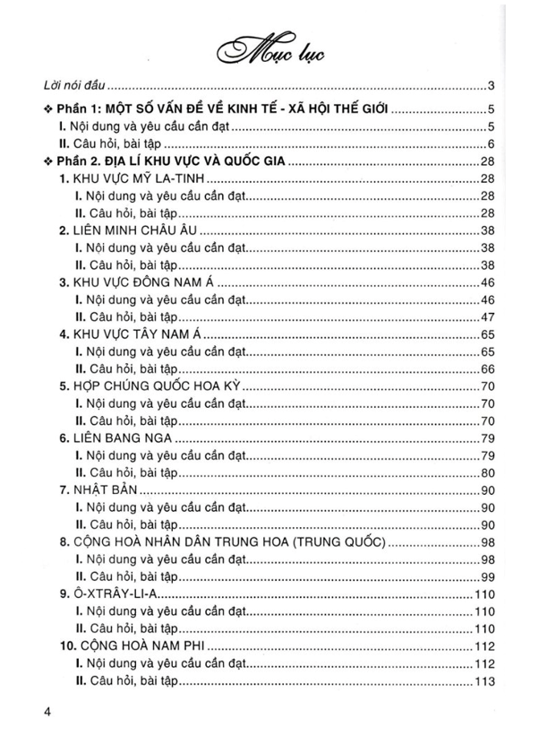 Trong mỗi vấn đề, khu vực, quốc gia có yêu cầu cần đạt (bám sát theo Chương trình giáo dục môn Địa lí lớp 11); câu hỏi và bài tập.