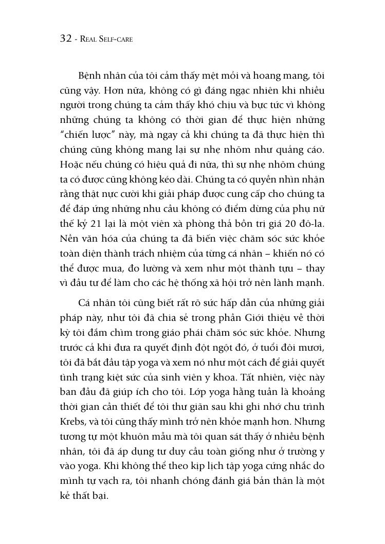 Ngày nay, khi nói đến “chăm sóc bản thân”, nhiều người nghĩ ngay đến những buổi spa thư giãn, khóa học yoga hay những phương pháp chăm sóc da, dưỡng tóc đắt tiền. Nhưng tất cả những điều đó có thật sự giúp chúng ta đạt được sự cân bằng và hạnh phúc không, hay chúng đơn thuần là những hình thức giải tỏa tạm thời để che đậy sự mệt mỏi và áp lực đang chồng chất? Đó chính là câu hỏi mà bác sĩ tâm thần chuyên về sức khỏe tinh thần phụ nữ Pooja Lakshmin đặt ra trong “Chăm sóc bản thân thật sự” (tựa gốc: Real self-care), một quyển sách đáng đọc trong thời đại phát triển bùng nổ của lĩnh vực chăm sóc sức khỏe thể chất và tinh thần.