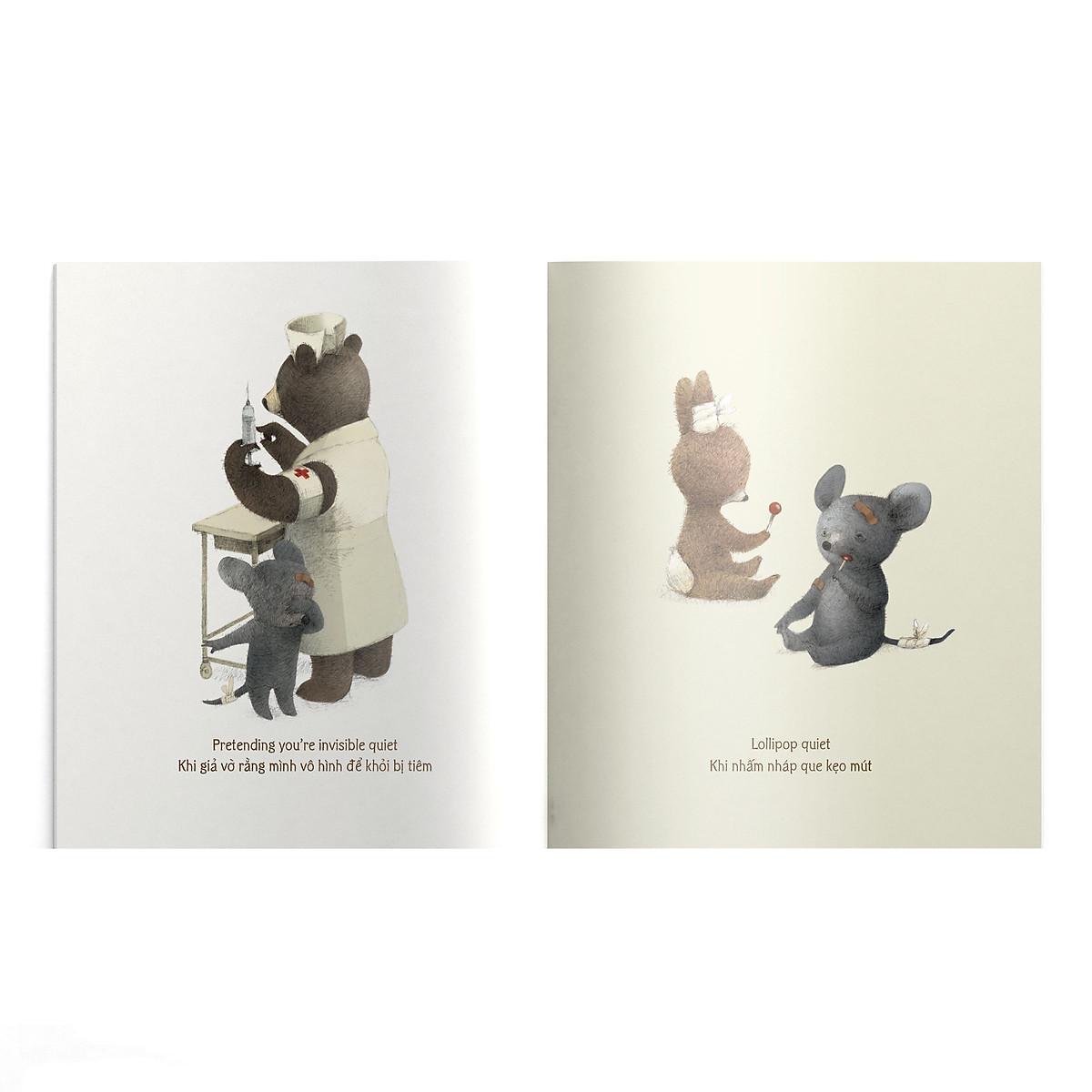 Cuốn sách là bộ sưu tập những khoảng lặng mà bất kỳ ai cũng có thể bắt gặp trong đời: khi là người đầu tiên thức giấc, khi rỉ tai nhau những bí mật, khi chăm chú tô màu… Và còn những khoảnh khắc im lặng nào khác nữa, mời các em cùng khám phá nhé.