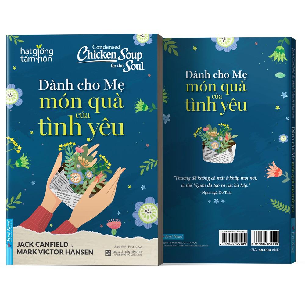 - DÀNH CHO MẸ MÓN QUÀ CỦA TÌNH YÊU Tình yêu thương của mẹ dành cho ta xuất phát từ những điều dung dị và giản đơn hàng ngày. Có một công việc không có ngày về hưu mang tên “làm Mẹ". Lần cuối bạn nói "con yêu Mẹ" là khi nào? Đã bao giờ bạn tự hỏi, Mẹ cảm thấy như thế nào khi nghe được câu nói đó từ bạn chưa? Mỗi người sẽ có cách thể hiện tình cảm riêng. Tuy vậy, dù là ở đâu, làm gì, thì tình mẫu tử đều thiêng liêng và đáng trân quý. Tình cảm đó không thể đong đếm, không rõ nông sâu, càng không rõ hình thù. Làm thế nào để những người con hiểu thấu được lòng Mẹ, cũng như làm sao để những người Mẹ có thể truyền đạt được hết sự yêu thương của mình dành cho con? Jack Canfield và Mark Victor Hansen đã cùng nhau thực hiện cuốn sách "Dành cho Mẹ - Món quà của tình yêu" như một sự tri ân dành cho các bà mẹ ở khắp nơi trên thế giới. 34 mẩu chuyện ngắn trong “Dành cho Mẹ - Món quà của tình yêu” hy vọng sẽ đem lại những phút giây êm đềm đến với quý độc giả, đặc biệt là những ai đã, đang và sắp làm Mẹ, cũng như những người con dù đang được ở bên hay cách xa Mẹ ngàn trùng. Cuốn sách sẽ một lần nữa khắc sâu trong bạn những hình ảnh về tình mẫu tử thiêng liêng, và đâu đó trên đường đời, sâu thẳm trong trái tim, bạn sẽ mỉm cười.