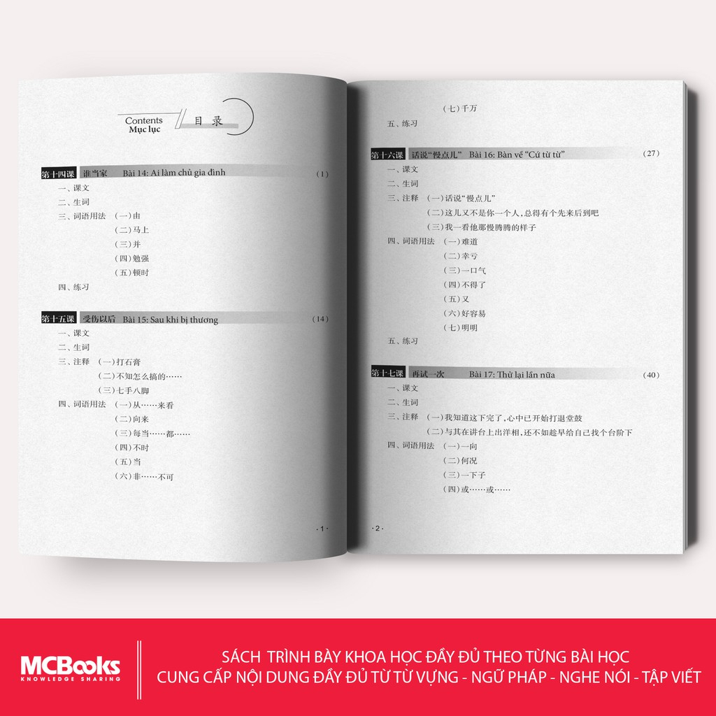 Các bài học trong “Giáo trình Hán ngữ 2 Tập 1 Quyển hạ phiên bản 3″ được Mcbooks thiết kế như sau: 1. Bài đọc, 2. Từ mới, 3. Chú thích, 4. Ngữ âm, Ngữ