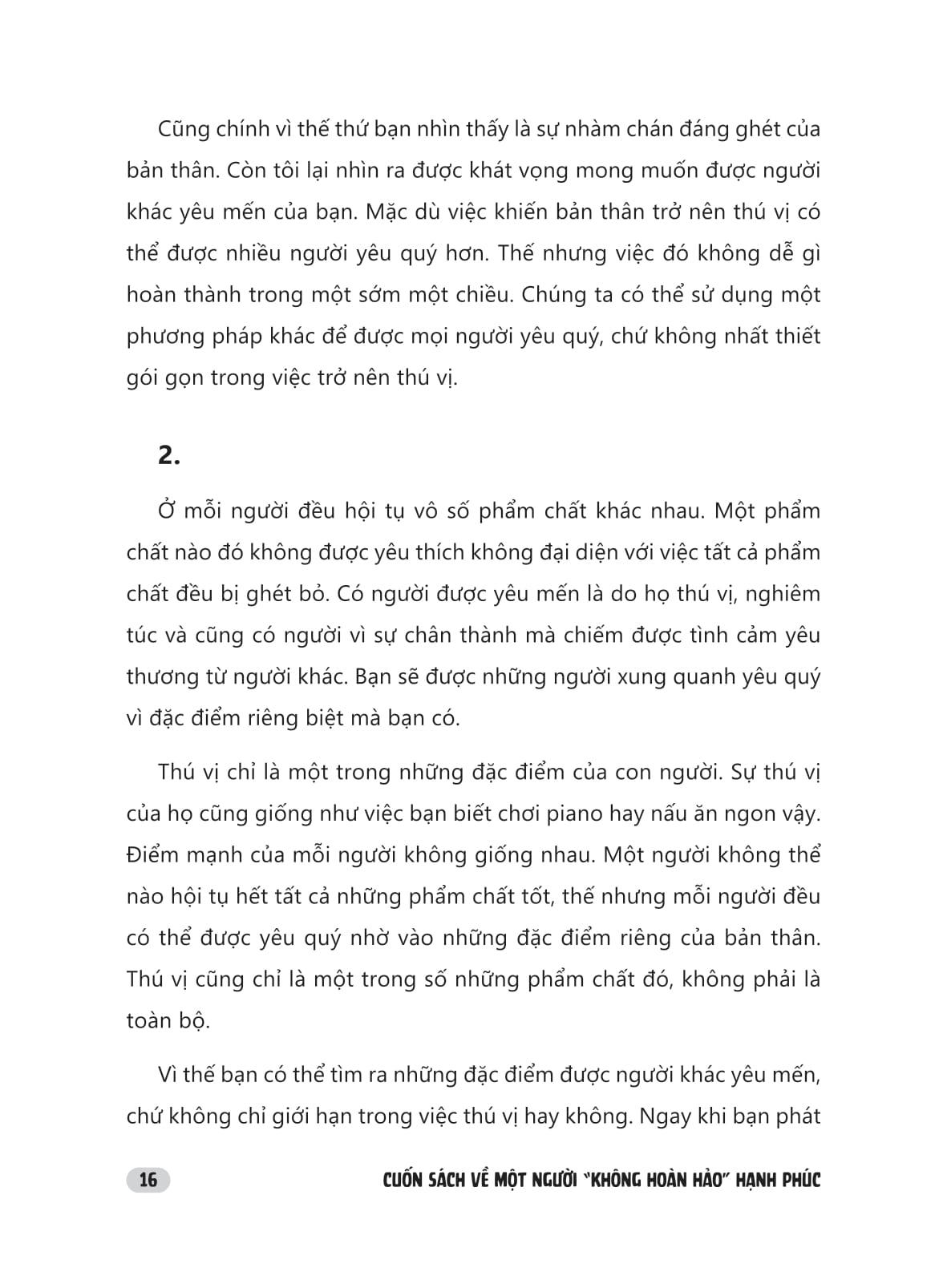 Cuốn sách về một người “không hoàn hảo” hạnh phúc mang đến những hiểu biết sâu sắc về bản chất con người; bộc lộ vô vàn mâu thuẫn, bất an của một thế giới hào nhoáng đẹp đẽ. Thông qua các góc nhìn độc đáo của tác giả, bạn sẽ được khám phá một cách trực tiếp và làm sáng tỏ nhiều khía cạnh khác nhau trong cuộc sống: tương lai, mối quan hệ, gia đình,… những điều mà bạn đang phải chật vật đối mặt.
