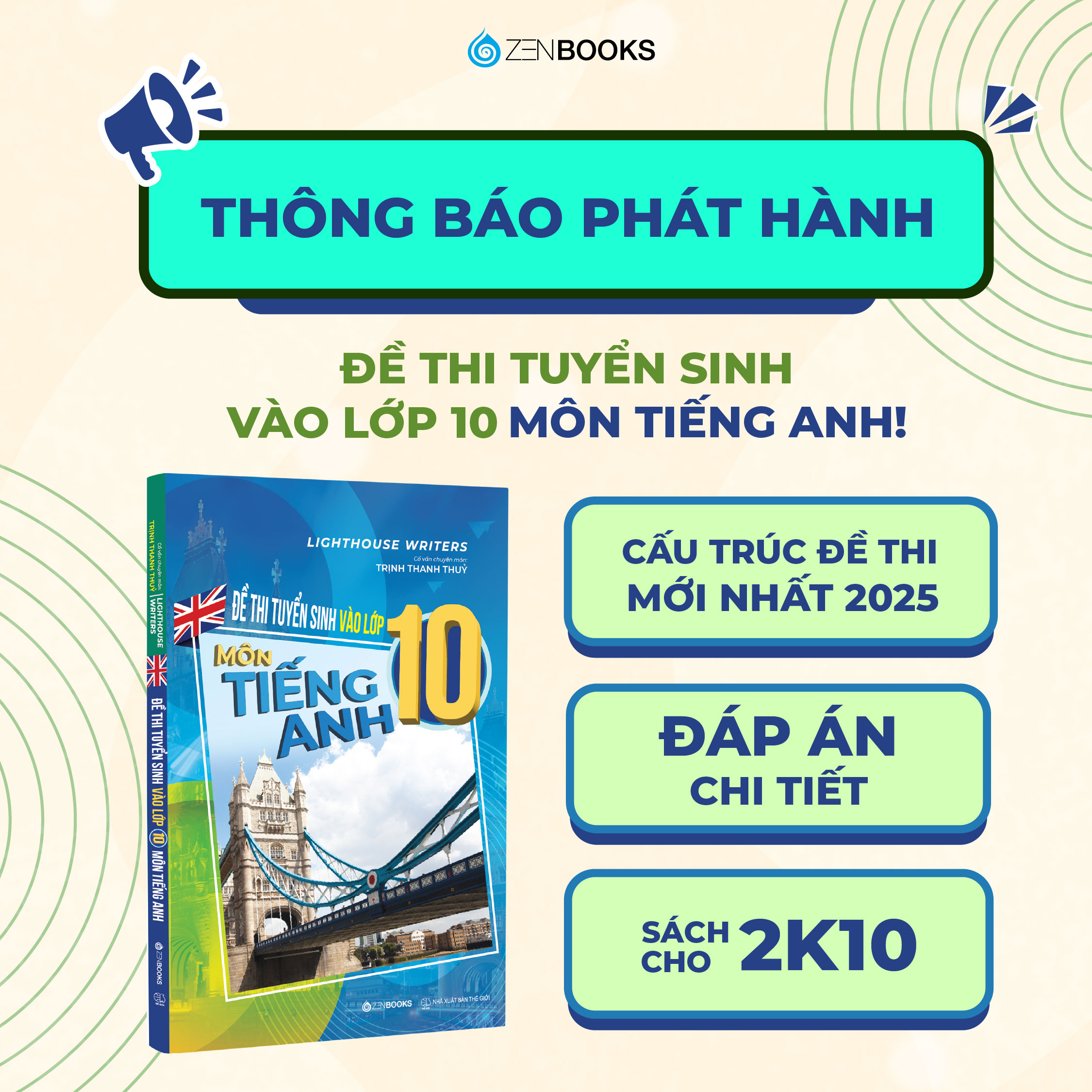 Mua tại TiktokĐề Thi Tuyển Sinh Vào Lớp 10 Môn Tiếng Anh (Có Đáp Án) Tác giả: Trịnh Thanh Thủy Công ty phát hành: Zenbooks Nhà xuất bản: Thế giới Năm xuất bản: 2025 Giới thiệu về sách Đề Thi Tuyển Sinh Vào Lớp 10 Môn Tiếng Anh Đề Thi Tuyển Sinh Vào Lớp 10 Môn Tiếng Anh (Có Đáp Án) là tài liệu ôn luyện lý tưởng cho học sinh lớp 9 trong giai đoạn nước rút trước kỳ thi vào lớp 10. Cuốn sách tổng hợp các đề thi bám sát cấu trúc chính thức, giúp học sinh làm quen với dạng đề, nâng cao kỹ năng và tự tin bước vào kỳ thi quan trọng này. Nội dung nổi bật của sách