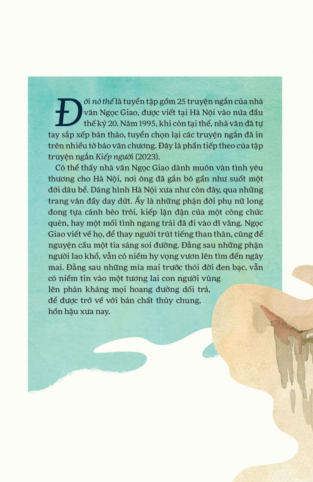 Có thể thấy nhà văn Ngọc Giao dành muôn vàn tình yêu thương cho Hà Nội, nơi ông đã gắn bó gần như suốt một đời dâu bể. Dáng hình Hà Nội xưa như còn đây, qua những trang văn đầy day dứt. Ấy là những phận đời phụ nữ long đong tựa cánh bèo trôi, kiếp lận đận của một công chức quèn, hay một mối tình ngang trái đã đi vào dĩ vãng. Ngọc Giao viết về họ, để thay người trút tiếng than thân, cũng để nguyện cầu một tia sáng soi đường. Đằng sau những phận người lao khổ, vẫn có niềm hy vọng vươn lên tìm đến ngày mai. Đằng sau những mỉa mai trước thói đời đen bạc, vẫn có niềm tin vào một tương lai con người vùng lên phản kháng mọi hoang đường dối trá, để được trở về với bản chất thủy chung, hồn hậu xưa nay.