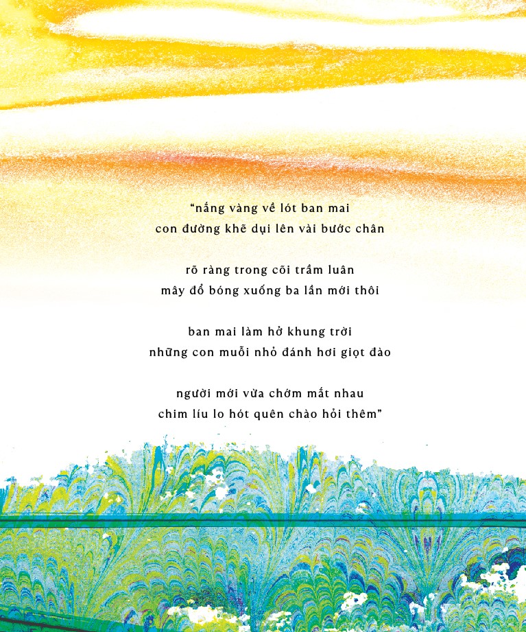 Mua tại TiktokNhà phát hành: Nhã Nam Nhà xuất bản: Hội Nhà Văn Tác giả: Trần Lê Khánh Số trang: 228 Kích thước: 17 x 25 cm “nắng vàng về lót ban mai con đường khẽ dụi lên vài bước chân rõ ràng trong cõi trầm luân mây đổ bóng xuống ba lần mới thôi ban mai làm hở khung trời những con muỗi nhỏ đánh hơi giọt đào người mới vừa chớm mắt nhau chim líu lo hót quên chào hỏi thêm"