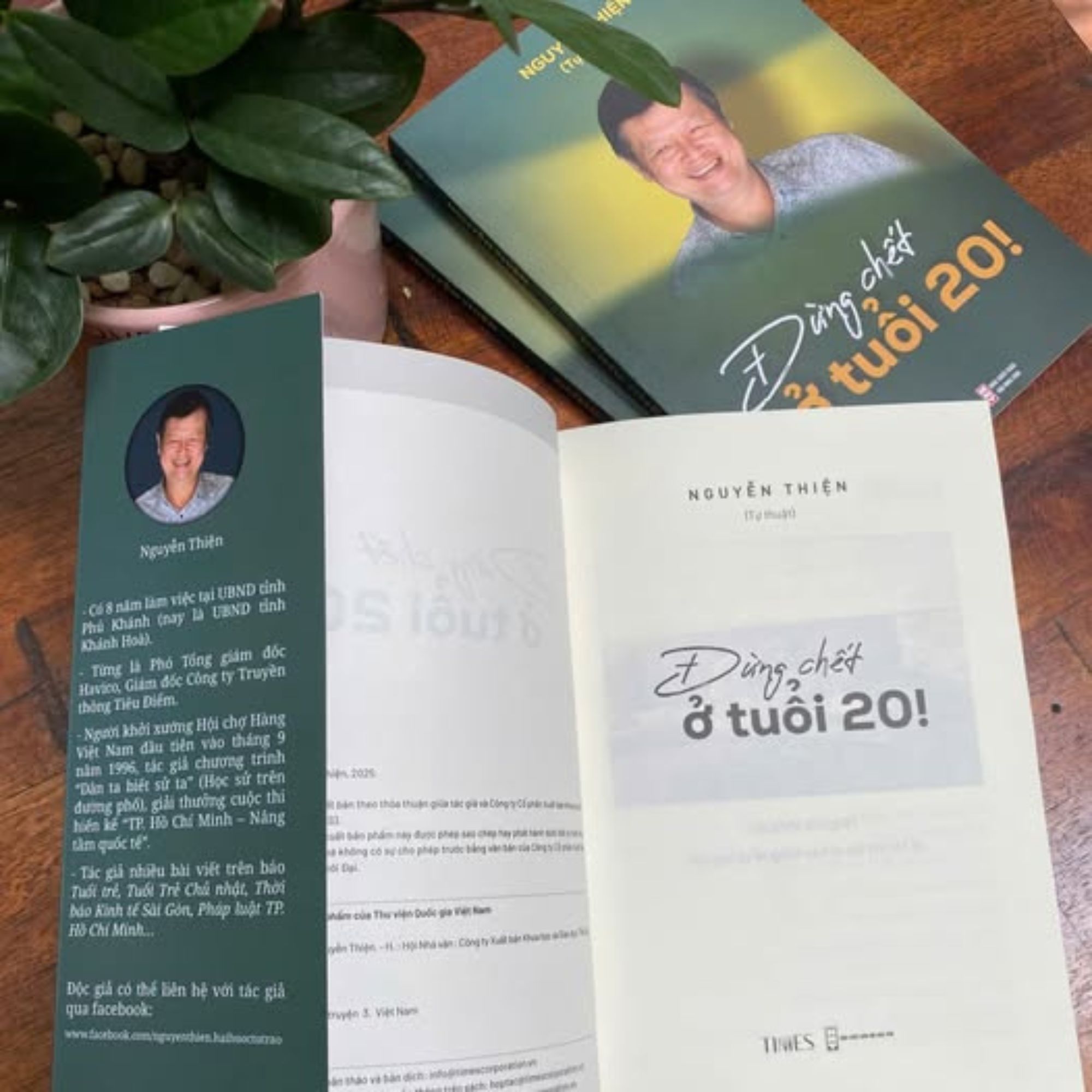 - Tác giả nhiều bài viết trên báo Tuổi Trẻ, Thời báo Kinh Tế Sài Gòn, Pháp Luật TP. Hồ Chí Minh… THÔNG TIN SẢN PHẨM Tên xuất bản phầm: Đừng chết ở tuổi 20! Tác giả: Nguyễn Thiện Khổ sách: 14.5 x 20.5 Bar: 8936219420655 ISBN: 978-632-618-810-3 Số trang: 176 trang GPPH: 601/QĐPH-NXBHNV Nhà xuất bản: Hội nhà văn Đơn vị phát hành: Công ty Cổ phần Xuất bản Khoa học và Giáo dục Thời Đại Thời gian phát hành: 09/2025 NỘI DUNG: Chết đây là cái chết tinh thần, là nguội lạnh bầu nhiệt huyết, là phai nhạt niềm đam mê, là không còn lửa. Tác giả tự nhủ: việc to tát, lớn lao theo gương các bậc vĩ nhân để cải cách, biến đổi xã hội thì e rằng mình không có khả năng, vậy thì hãy cố gắng làm những việc nhỏ mang lại giá trị cho cộng đồng theo kiến thức, sở trường, hoàn cảnh của mình. Nếu việc nhỏ mà có tính mới thì càng giá trị. Đừng chết ở tuổi 20! là cuốn tự thuật về 30 năm hoạt động xã hội không phải của một quan chức, cũng không phải một đại gia mà là của một công dân bình thường, kể lại những chuyện từ hiến kế cho Thủ tướng Võ Văn Kiệt vào tháng 7. 1995, Giải thưởng cuộc thi “TP. HCM nâng tầm quốc tế” cuối 2021, quá trình tổ chức các Chương trình như “Dân ta biết sử ta” đến Hội chợ Hàng Việt Nam đầu tiên tháng 9 năm 1996. MỤC LỤC Lời mở đầu