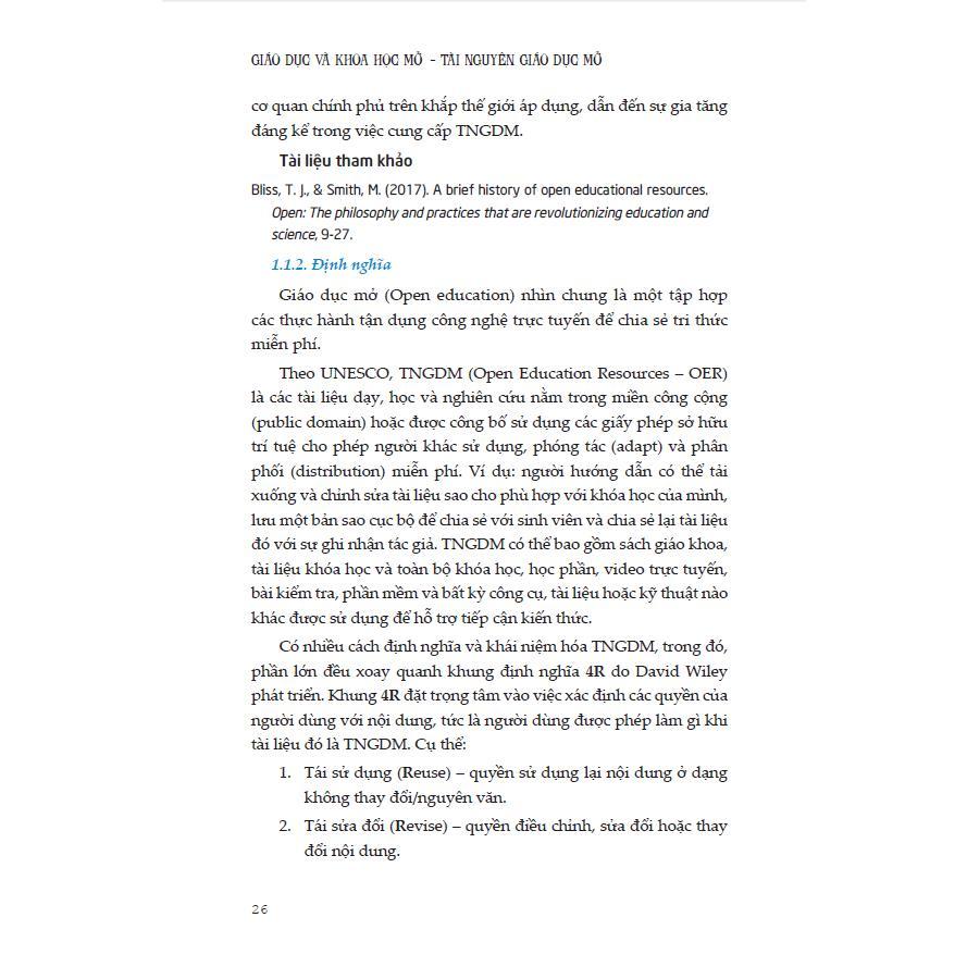 Ngoài ra, để đáp ứng nhu cầu của các cơ sở giáo dục và các tổ chức về việc giới thiệu, đào tạo, bồi dưỡng về giáo dục mở và khoa học mở, cuốn sách cũng cung cấp tại Phụ lục một đề cương khóa đào tạo ngắn ngày (4 buổi) về nội dung này.