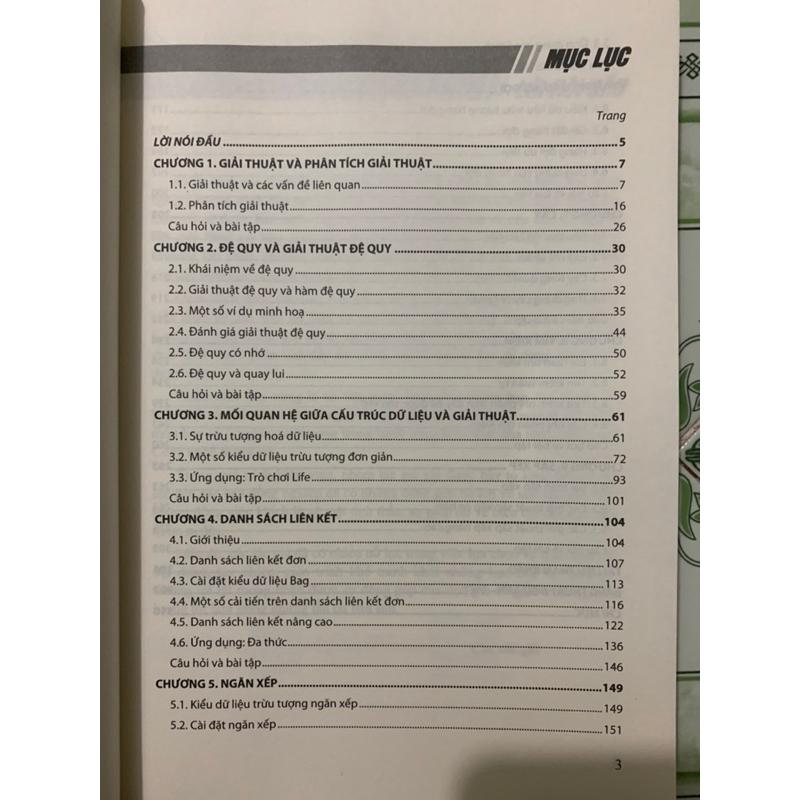 Mua tại TiktokNội dung gồm có: Chương 1. Giải thuật và phân tích giải thuật Chương 2. Đệ quy và giải thuật đệ quy Chương 3. Mối quan hệ giữa cấu trúc dữ liệu và giải thuật Chương 4. Danh sách liên kết Chương 5. Ngăn xếp Chương 6. Hàng đợi Chương 7. Cây Chương 8. Tìm kiếm Chương 9. Sắp xếp
