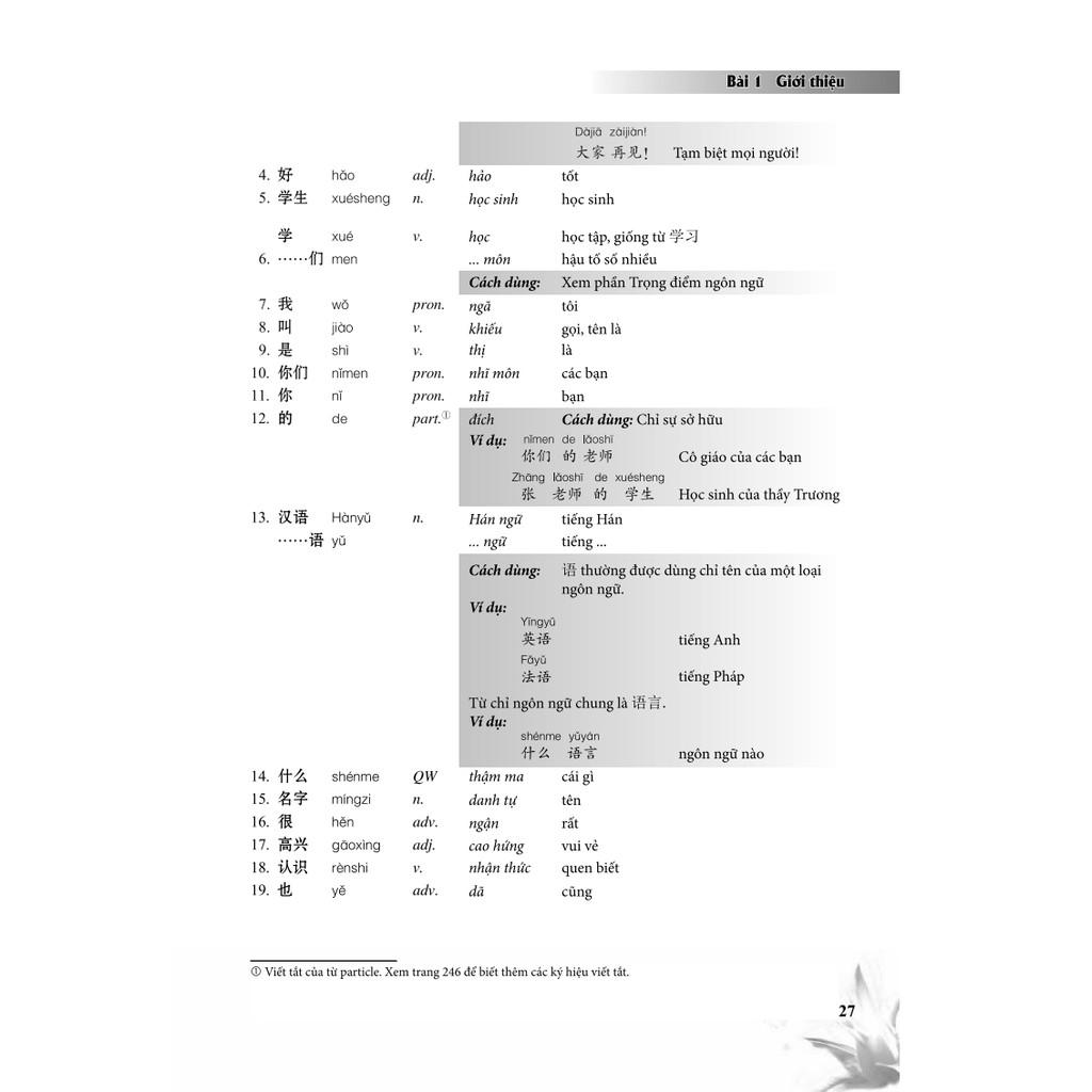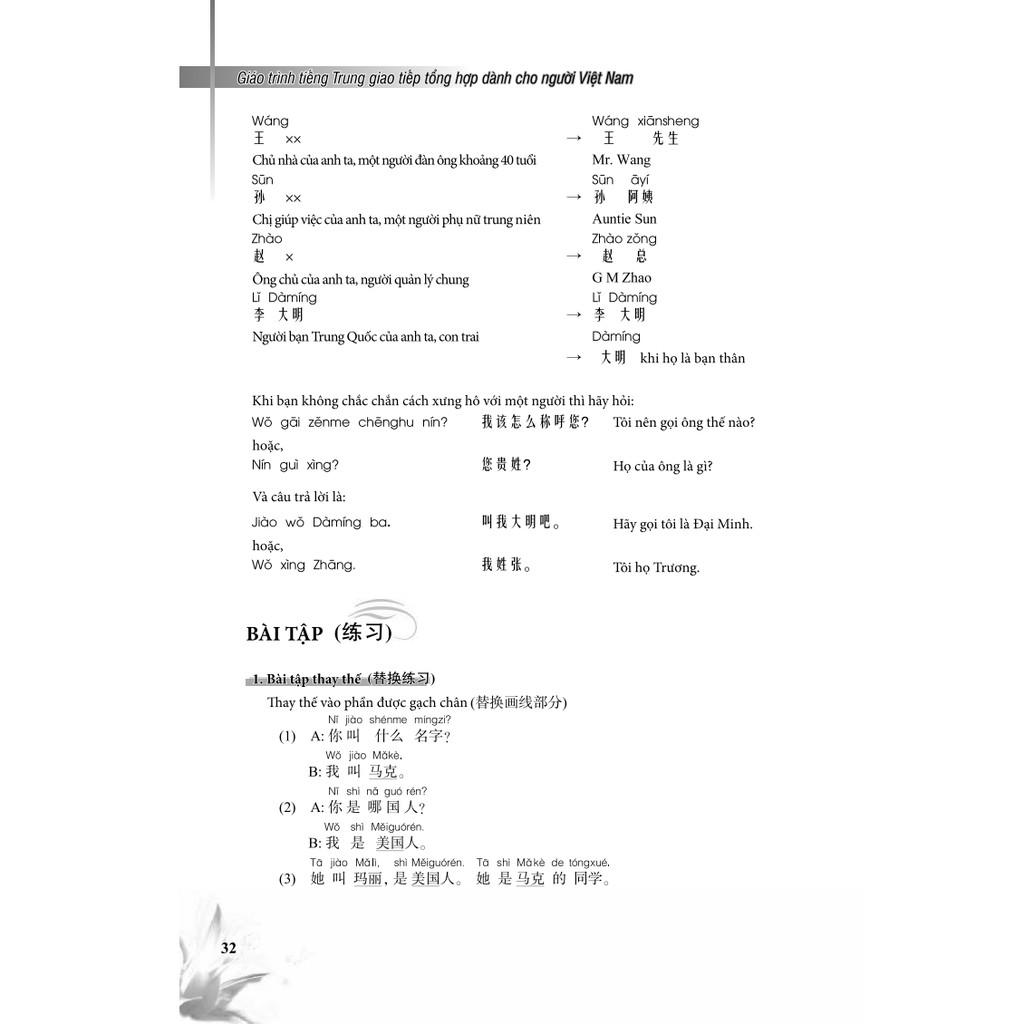 Giáo trình tiếng Trung giao tiếp tổng hợp dành cho người Việt Nam Cuốn sách có 15 bài, mỗi bài gồm: 1. Câu trọng điểm: Đưa ra trong bảng ở đầu tiên của mỗi bài,