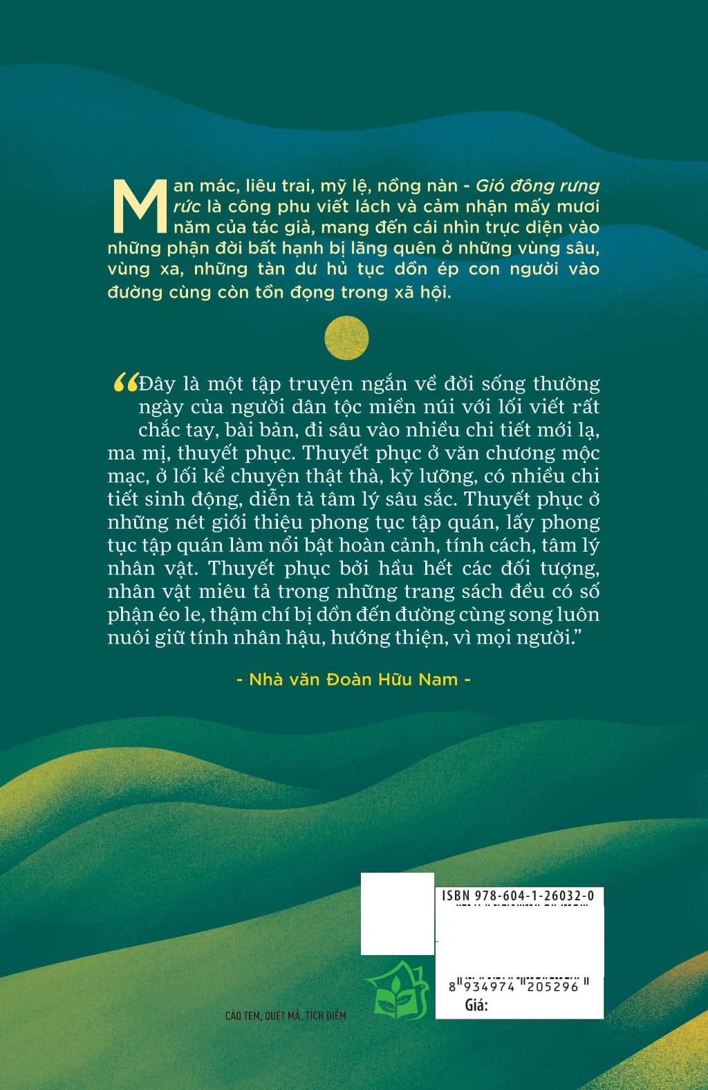Mua tại TiktokGió Đông Rưng Rức Man mác, liêu trai, mỹ lệ, nồng nàn - “Gió đông rưng rức” là tuyển tập gồm 10 truyện ngắn của nhà văn Hoàng Lệ Thủy. Đến với Sơn La từ năm 19 tuổi, công tác tại Bệnh viện Y Dược cổ truyền Sơn La, nhà văn đã có dịp tiếp xúc và gắn bó dài lâu với vùng đất này. Tác phẩm là công phu viết lách và cảm nhận mấy mươi năm của tác giả, mang đến cái nhìn trực diện vào những phận đời bất hạnh bị lãng quên ở những vùng sâu, vùng xa, những tàn dư hủ tục giết chết con người còn tồn đọng trong xã hội. Xuyên suốt tuyển truyện, tác giả đưa người đọc đến với miền đất Tây Bắc bạt ngàn núi rừng thăm thẳm, với những số kiếp lam lũ, chịu thương chịu khó vì cuộc sống mưu sinh, những truyền thuyết huyền bí, ma mị, những phong tục, tập quán truyền đời đậm đà bản sắc. Để rồi, từng trang văn lại gợi ra bao vết thương ám ảnh khôn nguôi, bao tủi hổ vì vị trí thấp hèn, bao trăn trở vì cơm áo gạo tiền, bao giọt nước mắt vì nỗi đau mất người thân, bao nỗi chán chường với cảnh sống tủi cực, bao tâm tư ẩn mật chưa từng hé lộ. Đó là cái thực tại của những con người còn cắn răng cam chịu “cái số” của m.ình, chưa dám vùng lên giành lại lẽ sống. Đó cũng là sự cảm thông của tác giả đối với những số phận phụ nữ thống khổ cùng cực vì bị động nương tựa vào đàn ông, vì bị hủ tục dồn ép vào đường cùng. Mỗi câu chuyện đều mang một thông điệp, niềm thương cảm riêng, đánh thức lòng trắc ẩn trong mỗi độc giả, kêu gọi hành động để mang đến những đổi thay tích cực cho cộng đồng, không chỉ trong các dân tộc thiểu số nói riêng mà toàn xã hội nói chung, bởi những bi kịch ấy có thể xảy ra ở bất cứ nơi đâu. “Có thể nói đây là một tập truyện ngắn về đời sống thường ngày của người dân tộc miền núi với lối viết rất chắc tay, bài bản, đi sâu vào nhiều chi tiết mới lạ, ma mị, thuyết phục. Thuyết phục ở văn chương mộc mạc, ở lối kể chuyện thật thà, kỹ lưỡng, có nhiều chi tiết sinh động, diễn tả tâm lý sâu sắc. Thuyết phục ở những nét giới thiệu phong tục tập quán, lấy phong tục tập quán làm nổi bật hoàn cảnh, tính cách, tâm lý nhân vật. Thuyết phục bởi hầu hết các đối tượng, nhân vật miêu tả trong những trang sách đều có số phận éo le, thậm chí bị dồn đến đường cùng song luôn nuôi giữ tính nhân hậu, hướng thiện, vì mọi người.” – Nhà văn Đoàn Hữu Nam.