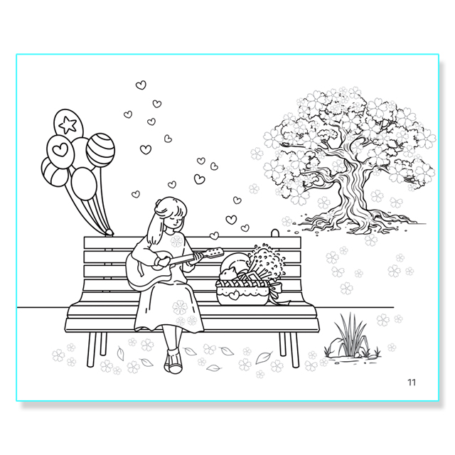 Mỗi trang trong cuốn sách đều là một tác phẩm nghệ thuật thu nhỏ, với các chủ đề gần gũi như hoa, chim, cầu vồng, và các nhân vật dễ thương. Những hình vẽ này được thiết kế một cách cẩn thận, tạo nên một không gian yên bình, ấm áp và dịu dàng.