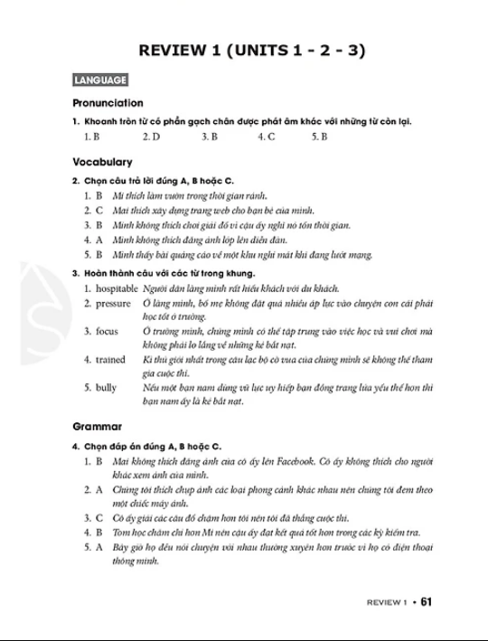 Bài giải và bài dịch (Solutions & Translations): giải các bài nghe, giải và dịch tất cả các bài hội thoại, bài đọc trong sách giáo khoa. (Lưu ý: Học sinh cần tự làm bài tập và nghe đĩa CD trước khi tham khảo phần này).