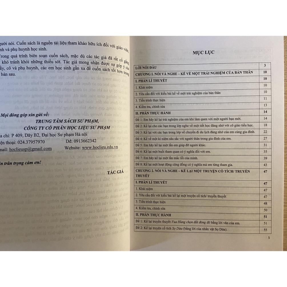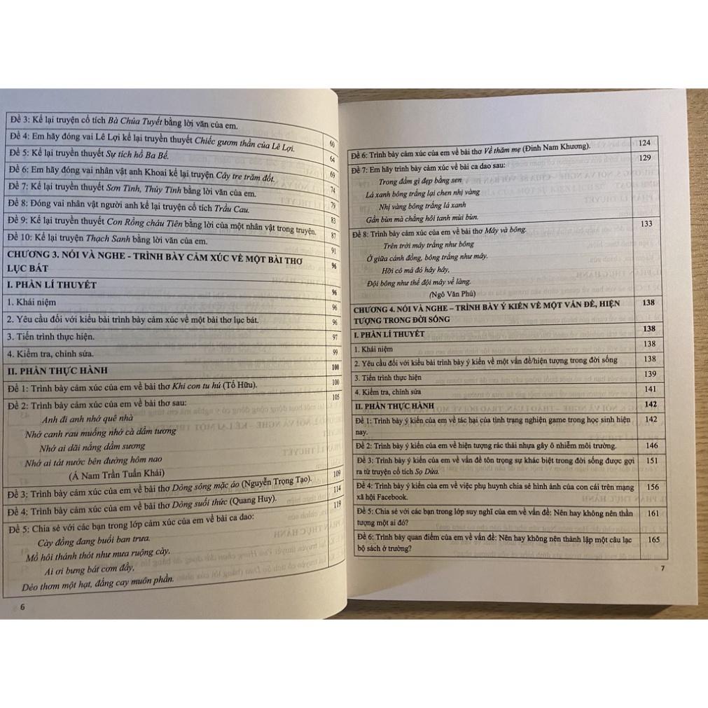 Cuốn sách Hướng dẫn thực hành nói và nghe trong môn Ngữ văn 6 theo nhằm hướng Chương trình Giáo dục phổ thông mới (dùng chung cho ba bộ sách Kết nối tri thức với cuộc sống; Cánh diều, Chân trời sáng tạo) được biên soạn dẫn học sinh thực hành nói – nghe đối với năng lực nói – nghe của học sinh ti sống nói chung. kiểu bài cụ thể; từ đó phát triển e đối với các kiêu bài c sinh trong môn học c Ngữ văn nói riêng, tr trong cuộc Cuốn sách tập trung hướng dẫn thực hành nói – nghe các kiểu bài: Kể về một trải nghiệm của bản thân; Kể lại một truyện cổ tích/ truyền thuyết; Trình bày cảm xúc về một bài thơ lục bát; Trình bày ý kiến về một vấn đề, hiện tượng trong đời sống; Chia sẻ với bạn bè về một cảnh sinh hoạt; Thảo luận nhóm về một vấn đề cần thống nhất giải pháp; Trao đổi, thảo luận về ý nghĩa của một sự kiện lịch sử. Mỗi kiểu bài được cấu trúc gồm hai phần: Phần lí thuyết và phần thực hành. Phần lí thuyết cung cấp khái niệm, yêu cầu, tiến trình thực hiện và các tiêu chí tiến hành đánh giá, kiểm tra chỉnh sửa đối với kiểu bài đó. Phần thực hành là minh chứng cụ thể sự vận dụng những hướng dẫn trong phần lý thuyết vào một số đề văn theo các bước: trước khi nói, trong khi nói và sau khi nói