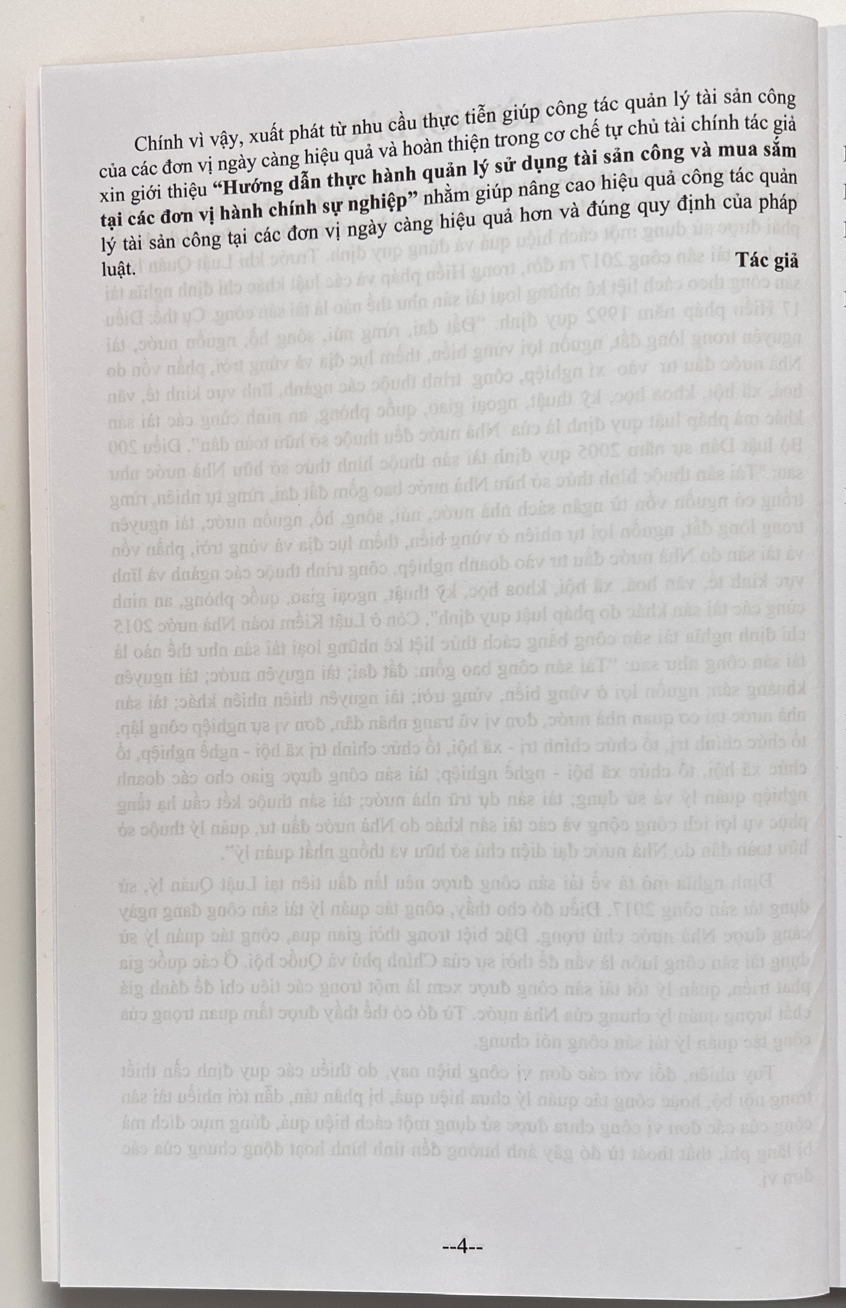 Chính vì vậy, xuất phát từ nhu cầu thực tiễn giúp công tác quản lý tài sản công của các đơn vị ngày càng hiệu quả và hoàn thiện trong cơ chê tự chủ tài chính tác giả xin giới thiệu "Hướng dẫn thực hành quản lý sử dụng tài sản công và mua sắm tại các đơn vị hành chính sự nghiệp" nhằm giúp nâng cao hiệu quả công tác quản lý tài sản công tại các đơn vị ngày càng hiệu quả hơn và đúng quy định của pháp luật.