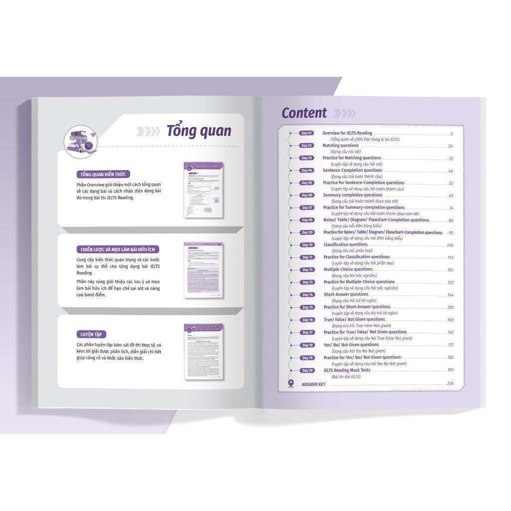 - Sách cung cấp lộ trình học cấp tốc IELTS Reading trong vòng 20 ngày: